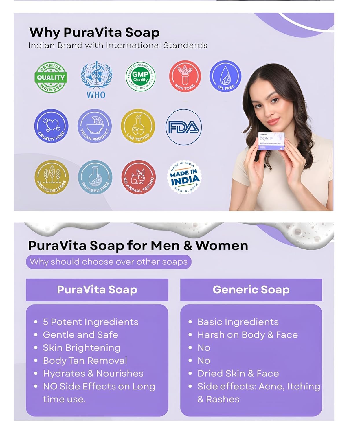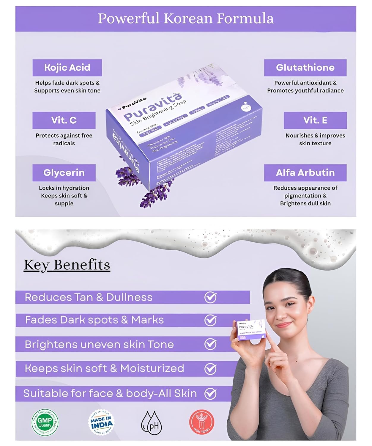SAFE & CLEAN FORMULA – NO PARABENS OR HARSH CHEMICALS: PuraVita is a dermatologist-tested glutathione soap for skin whitening designed for Indian skin. It contains no parabens, sulfates, or artificial bleach—only skin-safe actives that work gently on oily, dry, combination, or sensitive skin. This skin whitening soap for women and men is crafted to deliver lasting clarity without irritation, peeling, or dryness.