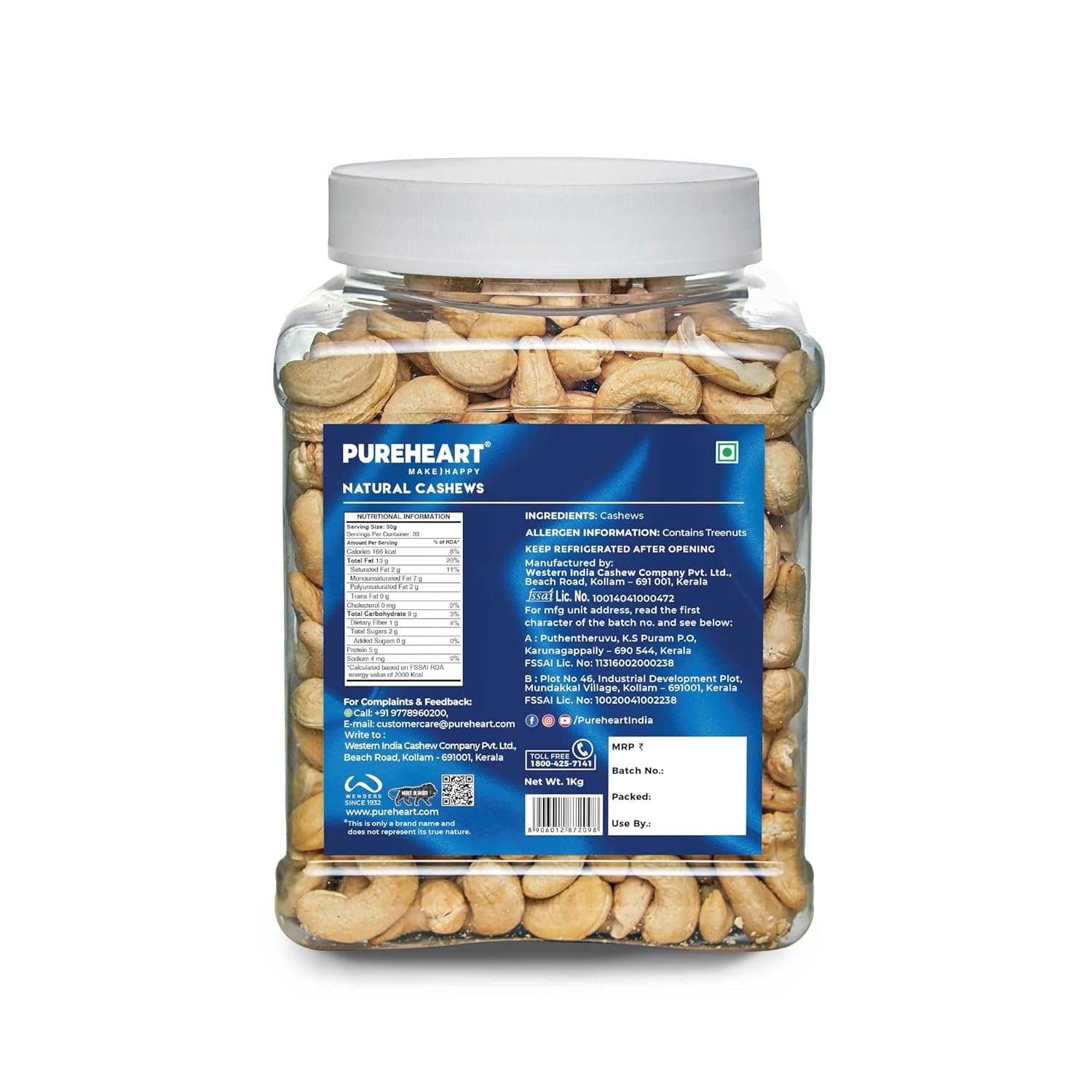 Pureheart Nutreat Natural Cashews (1 kg) Premium Whole Crunchy Cashewnuts/Kaju/Dry Fruit – Reusable Jar