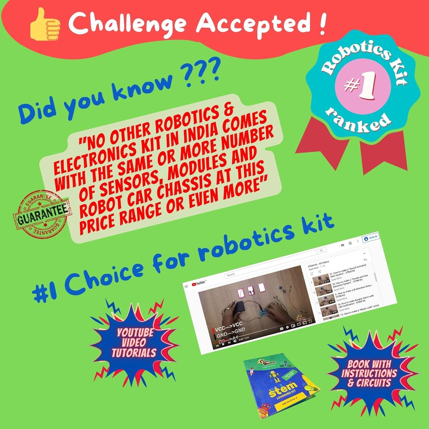 Comes with a handy colorful book with detailed projects circuits. You can make interesting projects like;