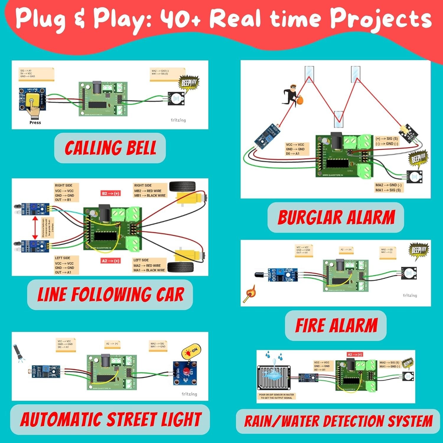 STEM based electronics kit will bring out your innovative ideas. Explore different possibilities with our DIY kit.Different real-world sensors like Gas/Smoke sensor, Fire sensor, Water sensor, Infrared, Photo-resistor, touch sensors and many more are included.Build interesting projects like Bugler alarm, Laser Security system, overhead tank alarm, line following car, Obstacle avoiding car, automatic water tap etc. Over 200+ projects can be built with this kit.Use our Q-Box processors capability to build series and parallel circuit projects. Sky is the limit for your innovation.Absolutely NO coding/programming skills are required. With our easy to use plug and play wires, sensors and modules you are ready to go! All sensors and modules are compatible with micro-controllers.
