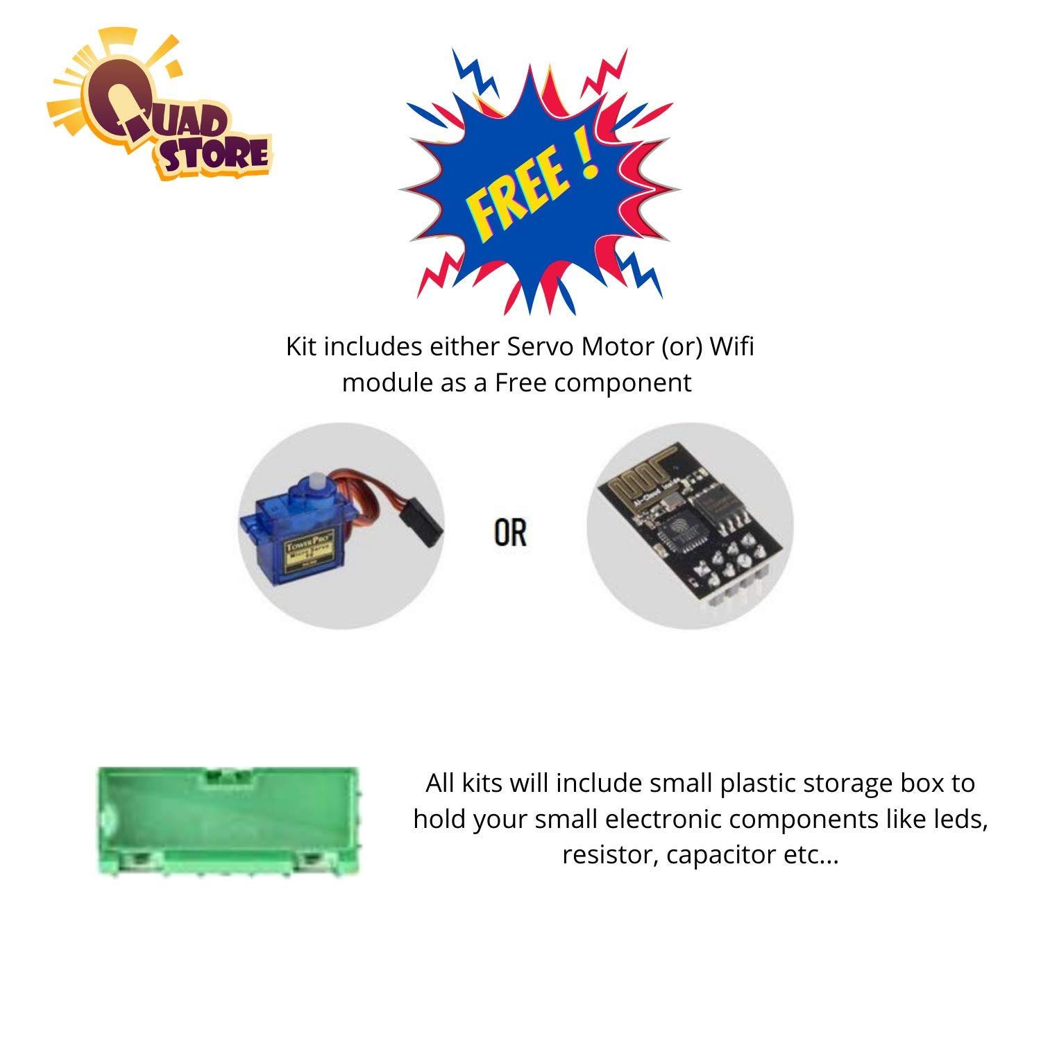 Just go, grab it!! To know why, read on :)Towards the end of December, 2018, I was looking for some kit to initiate the science of Robotics to my 11 year old son. That is when I came across the Quad Store – Super Starter Kit for Arduino Uno R3 (Beginner’s Kit) on Amazon. Little did I realize at that time, that I would end up spending more time with the kit that my son.This kit is a small, neat treasure trove of fun and learning. Till before December, 2018, I had never heard of an Arduino Board. And now the scenario is such that most of my free time is literally spent tinkering with the Board, the software and rest of the stuff.The components included in the kit are of good quality and packaged very neatly (for the details of what is included, see the product images either on Amazon or Quad Store website). The fact that a lot of thought has gone into creating the kit is evident when one sees there is a small storage box provided within the kit and more importantly there is a tray and some detachable dividers provided for ease of storage.There are about 28 small projects that you can undertake with this kit, starting from the simplest like blinking a LED to the more complicated like creating a snake game. These act as a springboard to propel you towards undertaking complicated projects.The entire guide along with codes or the sketches as they are called can be downloaded from the Quad Store Website under the Downloads section.The guide too is wonderfully laid out, starting with the introduction to the various parts of the Arduino Board and familiarization with the Arduino Software, known as the Integrated Development Environment.Under each project, the components are broken down to give a rough understanding of how the components and the circuit work, followed by an explanation of the terminology used in the sketch.So in case you wish to explore the world of electronics and Arduino, this kit, in my opinion, is a great starting point!!The cons:1) Though the standard contents list of the Kit on both the Amazon and Quad Store website, does not include either a servo motor (this is free only if you are lucky) or a tilt switch, the downloaded guide has one project each related to the above mentioned components. So my request to the Quad Store friends would be to either include the same in the kit (since these are not very expensive components) or to remove the projects from the guide, lest it cause confusion in the minds of every new Arduino Fan, who buys this set.2) Also the LCD display does not come with the pins attached to it, though a separate 40 pin header has provided that has to be soldered on to the LCD, which was a difficult job for me. May be Quad Store could find some solution to it.Two pieces of advice to the Arduino Initiate:1) Don’t just load the sketches on to the IDE, available as a download for the projects. Download them, read them and then type them yourself in the IDE, if you wish to learn Arduino and IDE better. Just a suggestion.2) There are a number of wonderful books are available on the subject like the ones authored by Massimo Banzi (the Father of Arduino), Simon Monk and many more. These books are a wonderful companion to this lovely little kit for those who wish to delve deep into the subject.HAPPY ARDUINOING!!!PS: I also happened to be one of the lucky hundred buyers and therefore received both a WiFi and a Bluetooth 4.0 module free, which was pre-included in my kit.