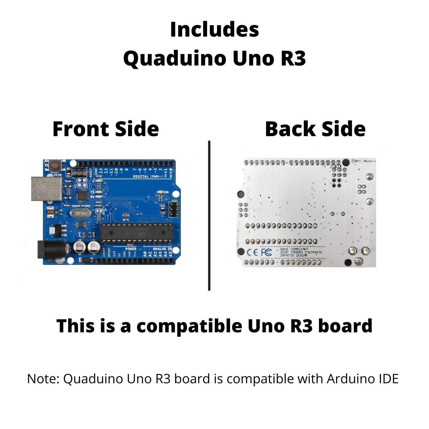 Includes Quaduino Uno R3 compatible Uno R3 board. Kindly refer listing picture for details.