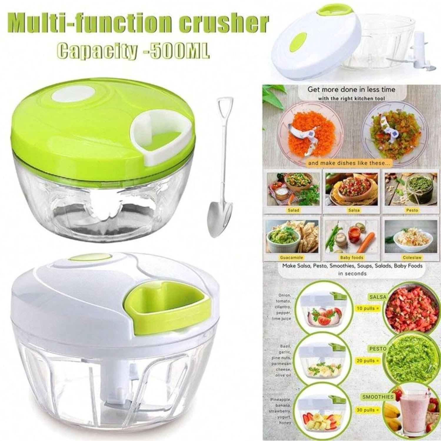 QuickChop 500 Mini Manual Vegetable Chopper – Compact & Efficient Kitchen Tool Let’s face it: chopping veggies can be a total pain. But what if we told you there’s an easier way to slice, dice, and chop like a kitchen wizard? Meet the QuickChop 500 Mini Manual Vegetable Chopper — your new best friend in the kitchen! 💚🍽️ This isn’t just any manual vegetable chopper. Oh no, this is the manual hand push chopper of your dreams! With stainless steel blades that effortlessly slice through veggies, fruits, nuts, ginger, garlic, and more, you’ll be chopping like a pro in no time. 🙌 Here’s why the QuickChop 500 is everything you need in your kitchen: 🔪 Compact & Powerful: It’s small, it’s sleek, and it gets the job done FAST. Don’t let the size fool you — this manual hand chopper is powerful enough to handle your toughest chopping jobs! Whether it’s onions, garlic, or those hard nuts, it’s ready to crush them all. 🌱 Simple & Easy to Use: No complicated buttons, no mess. Just press down on the handle, and voilà! Your ingredients are chopped to perfection in seconds. This manual cutter vegetable chopper gives you total control with zero fuss. 🍏 Stainless Steel Blades = Sharp & Durable: The high-quality stainless steel blades are built to last, so you won’t have to worry about them dulling anytime soon. Whether you’re chopping fruits, vegetables, or garlic — you can trust the vegetable chopper to handle it with ease. 💥 Perfect for Every Meal: From salads to stir-fries, the automatic vegetable chopper might sound cool, but there’s something just so satisfying about using this manual vegetable chopper. Chop all your veggies and fruits fresh, every single time. It’s the perfect tool for those who want quick, fresh ingredients without the hassle of big appliances. 🍴 Quick & Easy Cleanup: Because we know you don’t wanna spend your whole day washing dishes. After you’re done chopping, just rinse it, and you’re good to go. What You’ll Get in Your QuickChop 500 Box: 1x Manual Vegetable Chopper (Green) 1x Stainless Steel Blades for that extra sharp cut Super compact design for easy storage – perfect for small kitchens! Whether you’re a seasoned chef or a newbie cook, the manual hand push chopper is about to make your kitchen life so much easier. Say goodbye to chopping stress and hello to the easiest, most efficient chopping experience EVER! 🥒💚 Ready to level up your meal prep game? Grab your manual chopper vegetable chopper now and start chopping like a pro! 👩‍🍳👨‍🍳