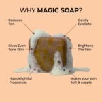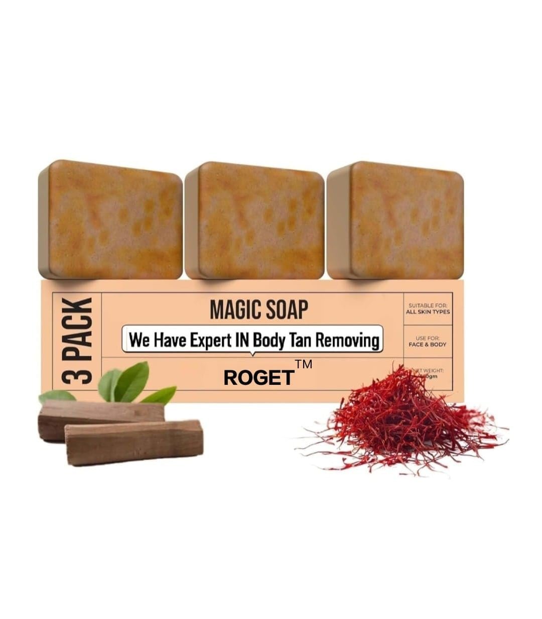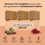 Saffron Present In The Soap Makes The Skin Brighter. Saffron Helps In Deeply Exfoliating The Pores Giving You A Cleansed, Fresh And Flawless Skin. Scars, Sun Spots, Dark Patches And Blemishes Fades Quickly. De-tan Removal Magic Soap Suitable For All Skin Types. Experience the artistry of soap making with our meticulously crafted Sandalwood & Saffron Magic Soaps for Bath / Skin Whitening Soap.