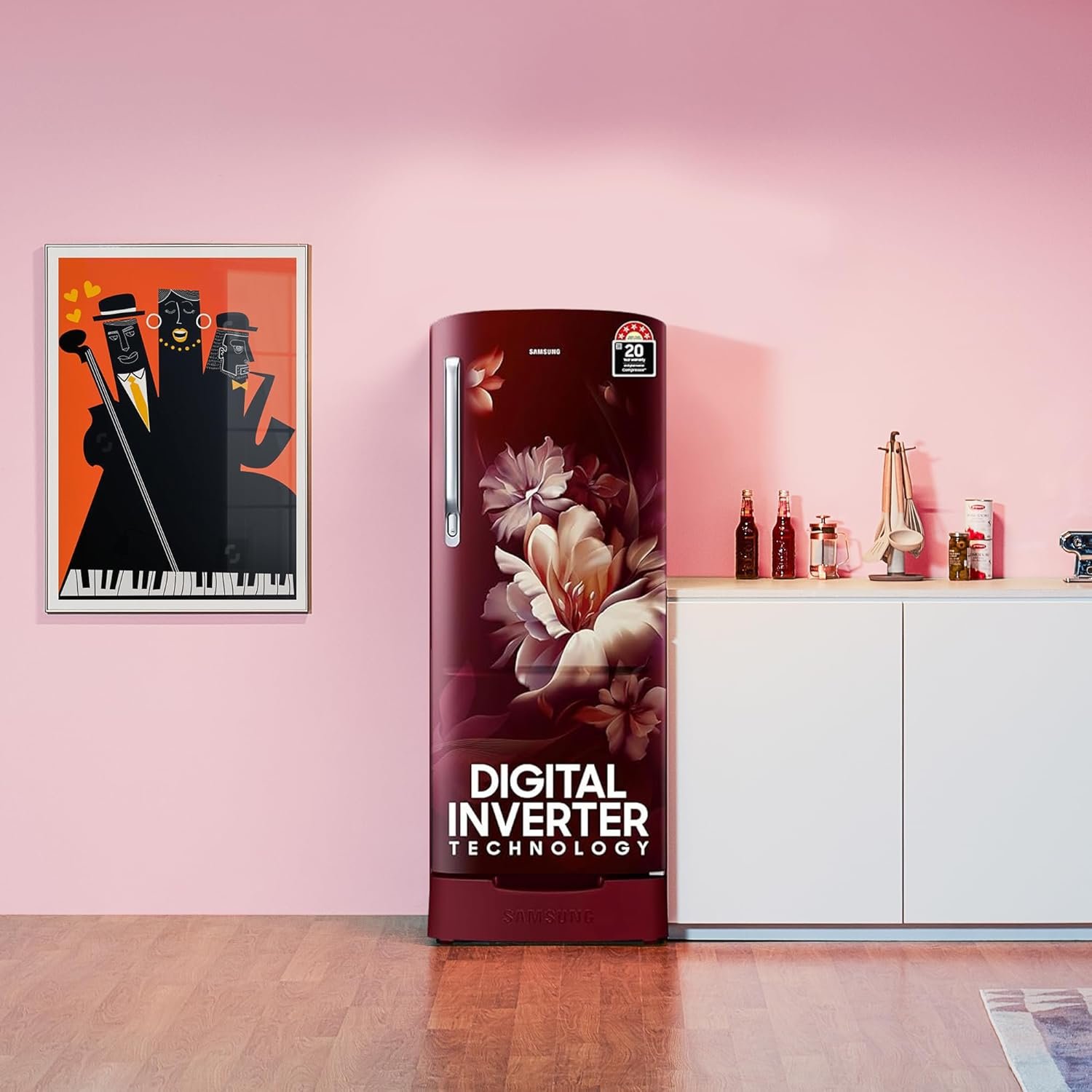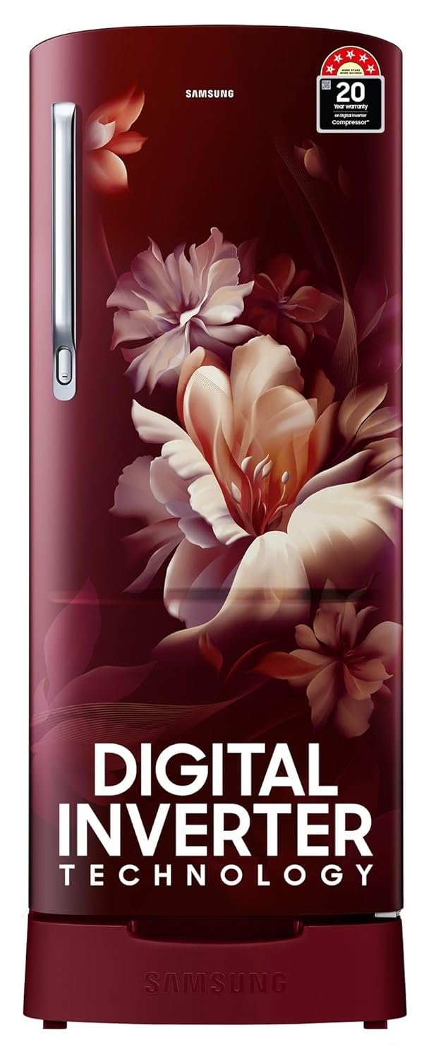 Samsung 183 L, 5 Star, Digital Inverter, Direct-Cool Single Door Refrigerator (RR20D2825RZ/NL, Midnight Blossom Red, Base Stand Drawer)