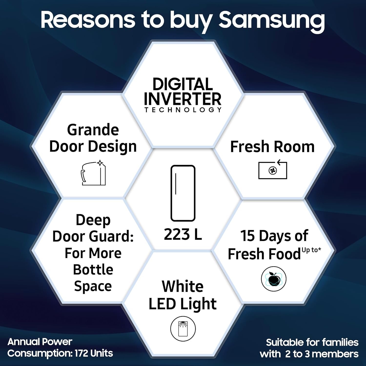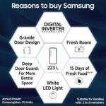 Samsung Exclusive Features : Fresh room | Grande Door Design | Stabilizer Free Operation (100v – 300v) | Smart Connect Inverter (Automatic) | Up to 15 Days of Fresh Food | Bar Handle | Lock & Key