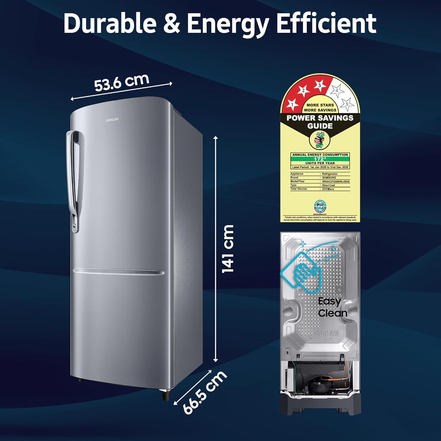 I recently purchased the Samsung 223 L, 3 Star Inverter Direct-Cool Single Door Refrigerator (RR24C2723S8/NL, Silver, Elegant Inox) 2024 Model, and I am thoroughly impressed with its performance and aesthetics. The Digital Inverter Compressor ensures energy efficiency and operates quietly, making it a perfect addition to any home.The 223-liter capacity is ideal for small families, offering ample storage space for all our refrigeration needs. The toughened glass shelves can withstand heavy loads, allowing us to store large containers without any concerns.The sleek and elegant design enhances the overall look of our kitchen, and the anti-bacterial gasket helps keep the interior hygienic by preventing the build-up of fungi and bacteria.Overall, this refrigerator combines functionality with style, making it a must-have appliance for any modern household. I highly recommend it to anyone looking for a reliable and aesthetically pleasing refrigerator.