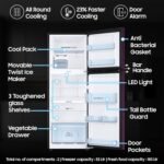 Additional Features : Stabilizer Free Operation (100v – 300v) | Multi Flow | Up to 15 Days of Fresh Food | Recess Handle | Door Alarm | Easy Clean Back | Veg Box | Big Bottle Guard (Deep Door Guard) | LED Light