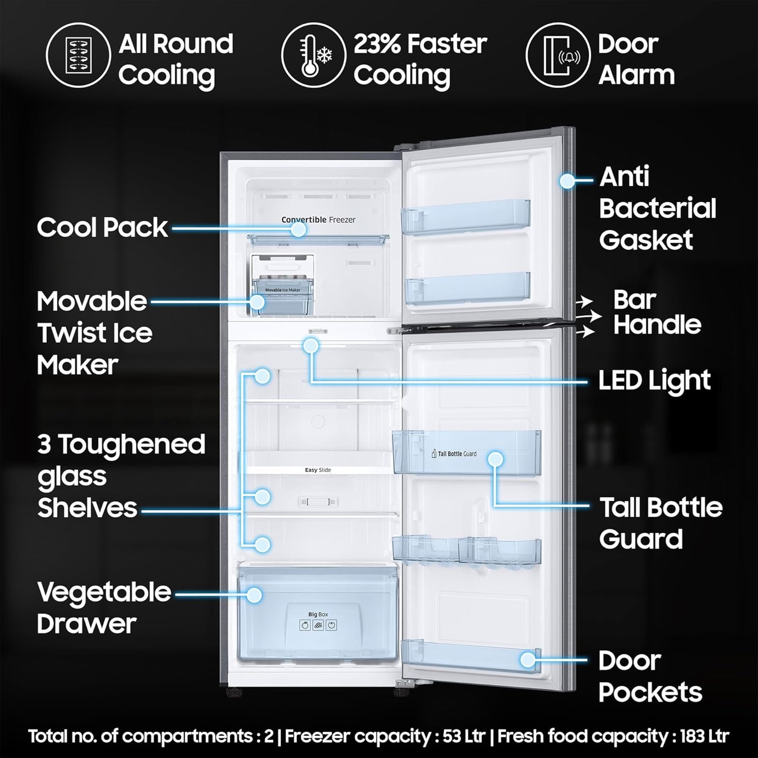 Interior Description : Fresh Food Capacity : 183 Ltr | Freezer Capacity : 53 Ltr | Total no. of compartments : 2 | Shelves : 2 | Vegetable Drawers : 1 | Shelf Type : Toughened Glass Shelves | Anti Bacterial Gasket | Temperature Control : External