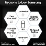 Samsung Exclusive Features : Convertible | Digital Display with Easy Touch Control | Power Cool | Fresh room | Easy Slide Shelf | All Round Cooling