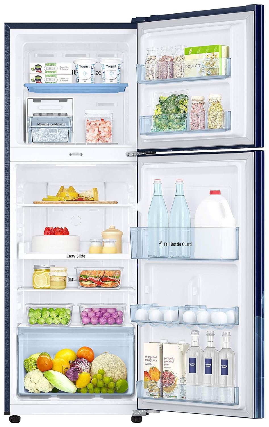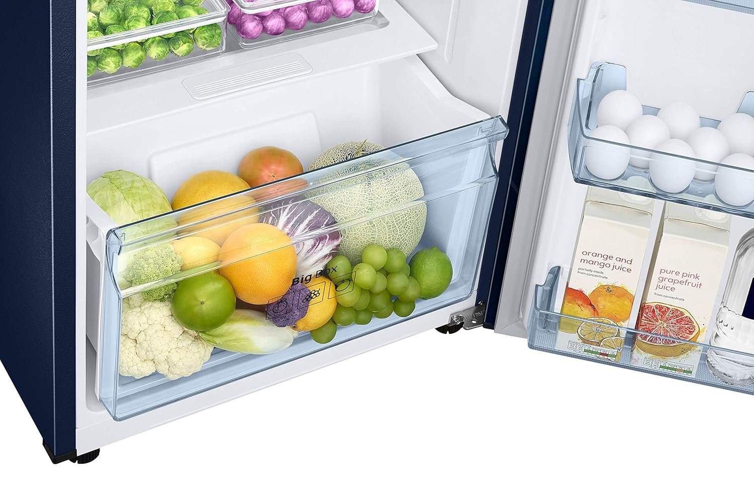 The Big Bottle Guard is deeper than shelves found in conventional refrigerators. You can store big containers of milk and juice in the door, along with two rows of beverage cans and bottles.