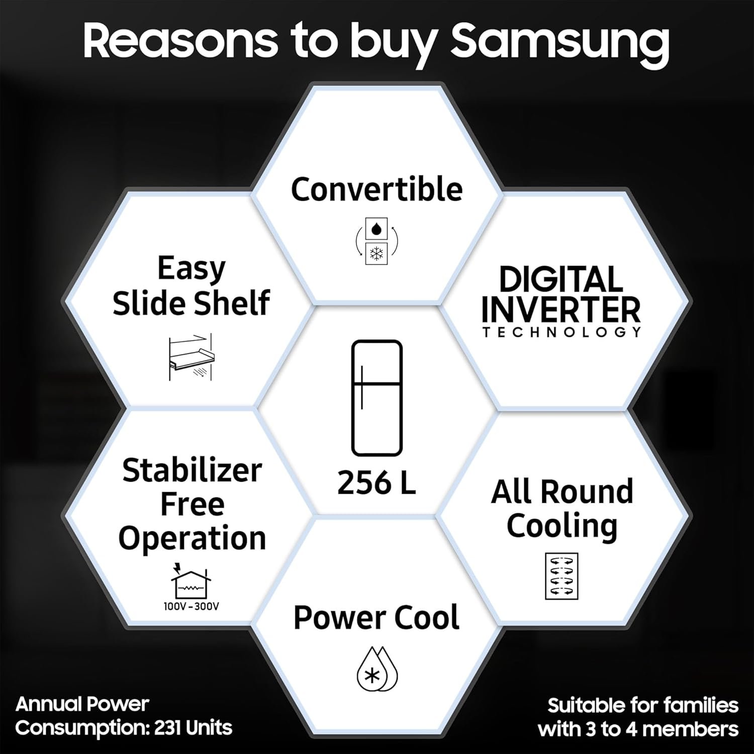 Samsung Exclusive Features : Convertible | Digital Display with Easy Touch Control | Power Cool | Fresh room | Easy Slide Shelf | All Round Cooling