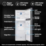 Additional Features : Stabilizer Free Operation (100v – 300v) | Multi Flow | Up to 15 Days of Fresh Food | Flat Door Design | Recess Handle | Easy Clean Back | Veg Box | Big Bottle Guard (Deep Door Guard) | LED Light