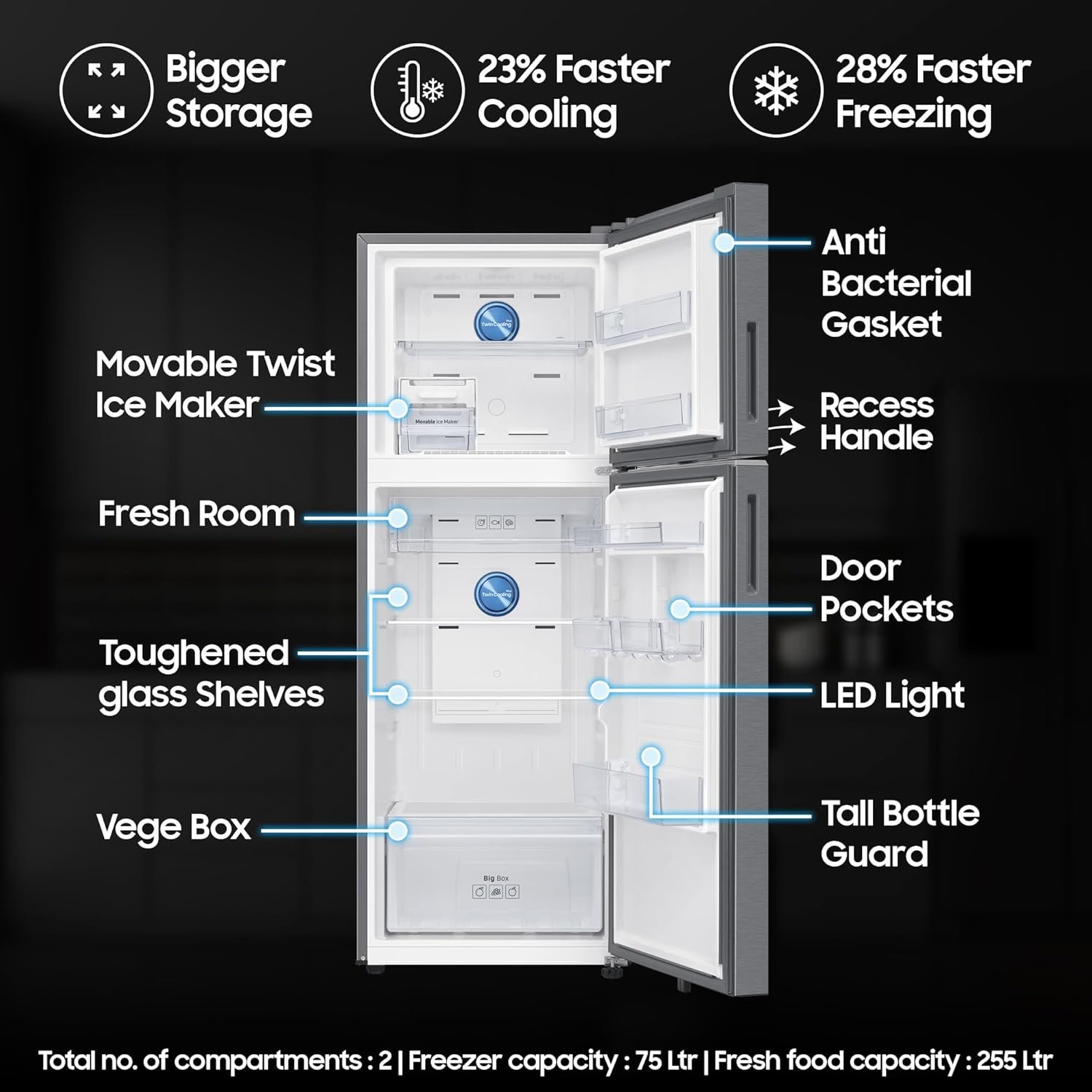 Interior Description : Fresh Food Capacity : 255 Ltr | Freezer Capacity : 75 Ltr | Total no. of compartments : 2 | Shelves : 3 | Vegetable Drawers : 1 | Shelf Type : Toughened Glass Shelves | Anti Bacterial Gasket | Temperature Control : Internal