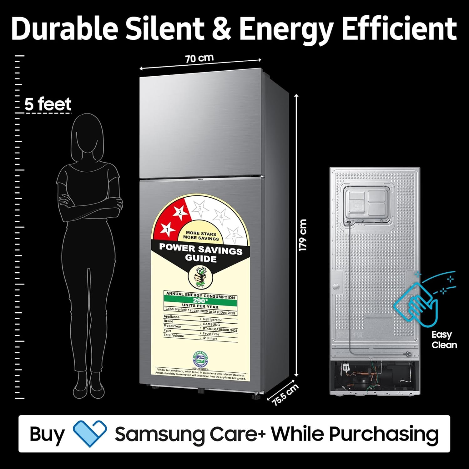 There is no refrigerator with 3 stars at this capacity. If you are not interested in buying a side by side refrigerator but want a bigger one than your conventional fridge then you can go for it. The fridge is silent and cools very quick.Cons:Door side groove handles. Not so comfortable to open with an item in your hand. Can be managed though.No light in freezer which is hardly used thoughPros:SilentBiggerBEE 3 star rated 2025Convertible freezerMovable ice tray – can be removed and use it for extra space if you don’t need ice cubesCan be controlled using app – not a fan of itAI enabled. Need to see power usageSamsung brand warranty