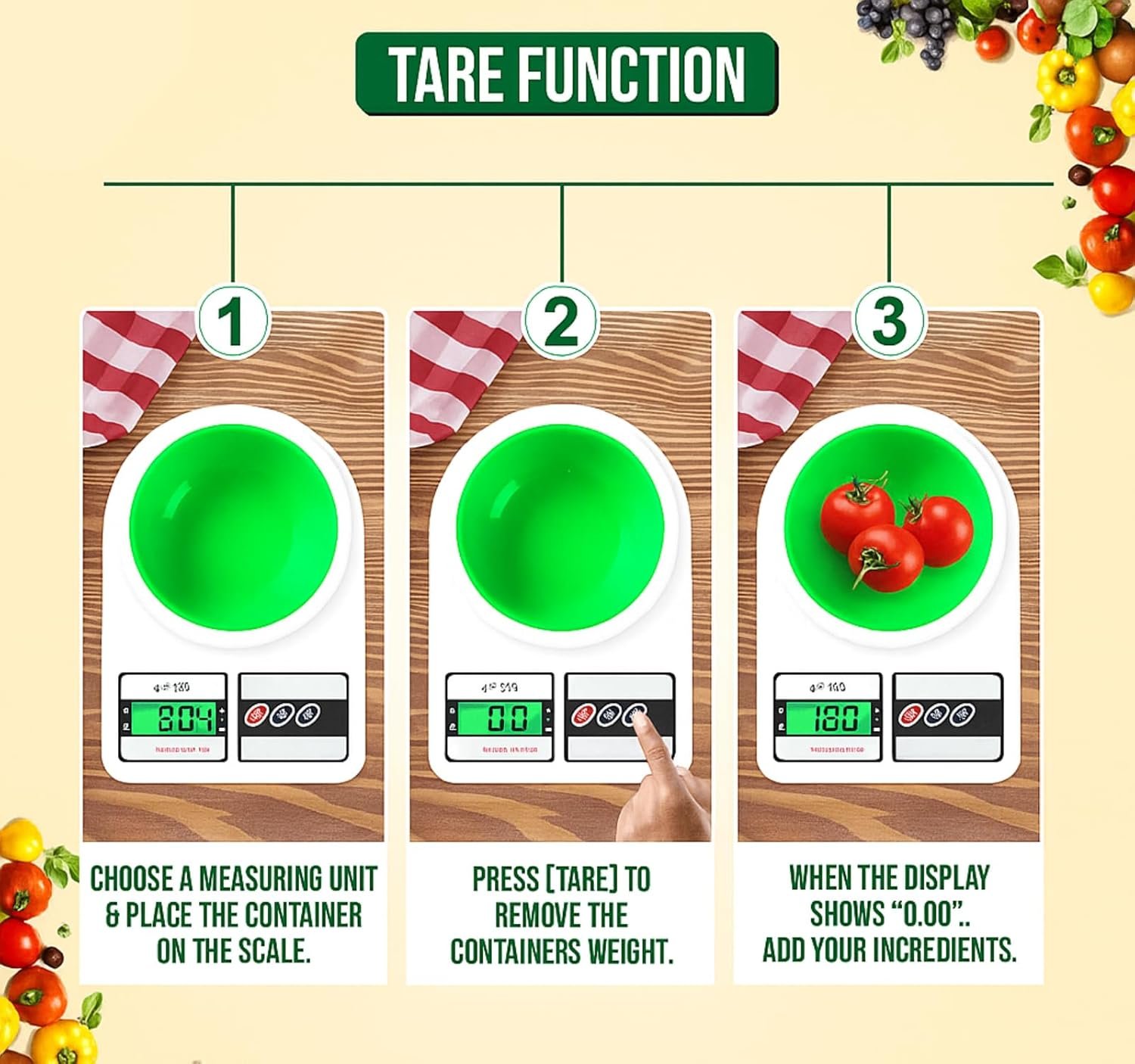 VERSATILE FUNCTIONALITY: Features multiple function buttons including tare option for precise ingredient measurements