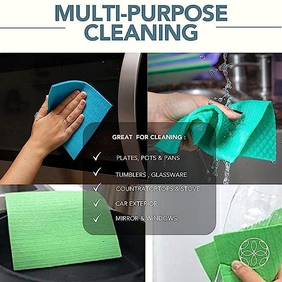 100% BIODEGRADABLE MATERIAL & REUSABLE: dishcloths are made of 70% cellulose and 30% cotton Material which is 100% biodegradable and Recyclable. These sponge wipes are enduring and reusable as you can use them more than one time, it is also absorbent and clean your surface with no buildup.
