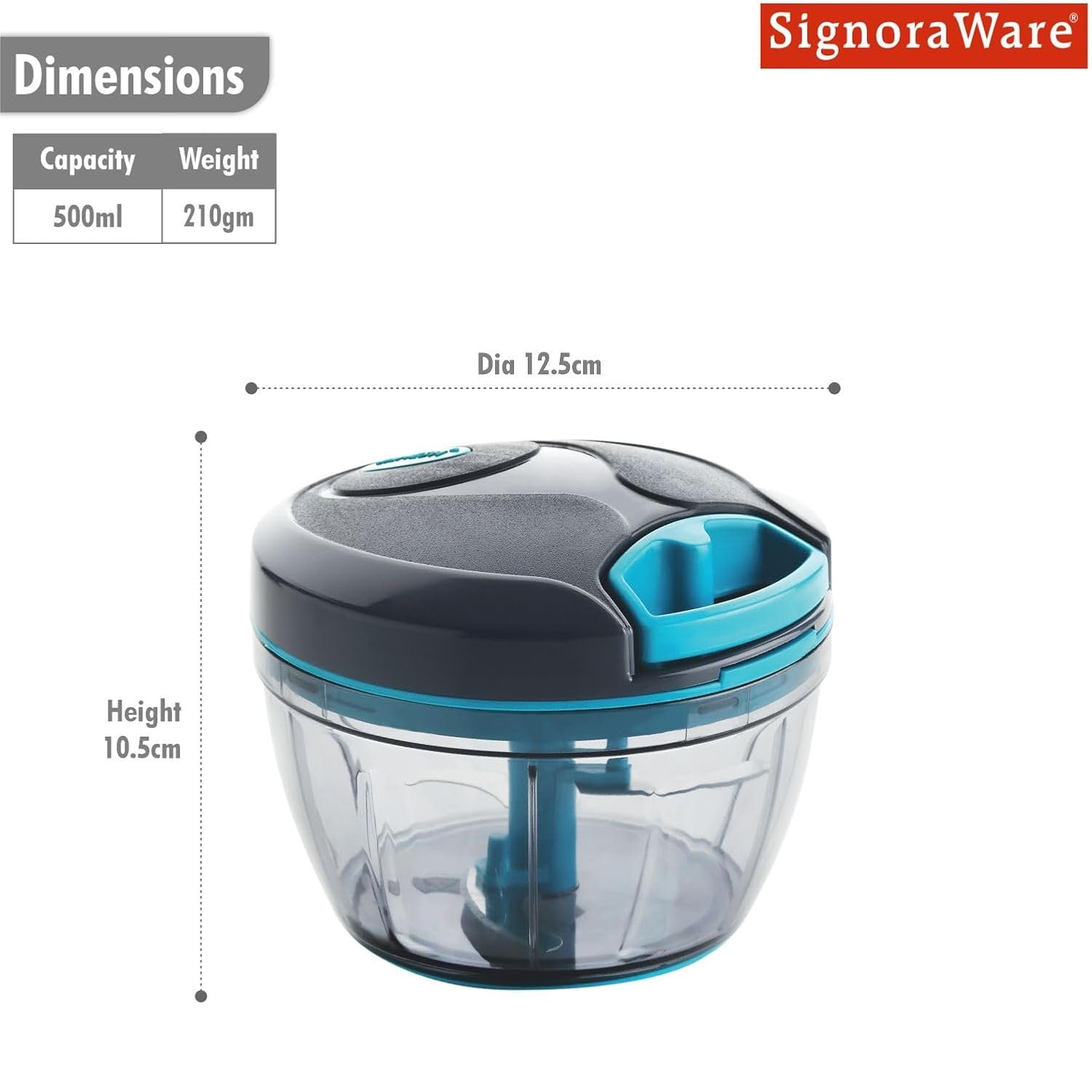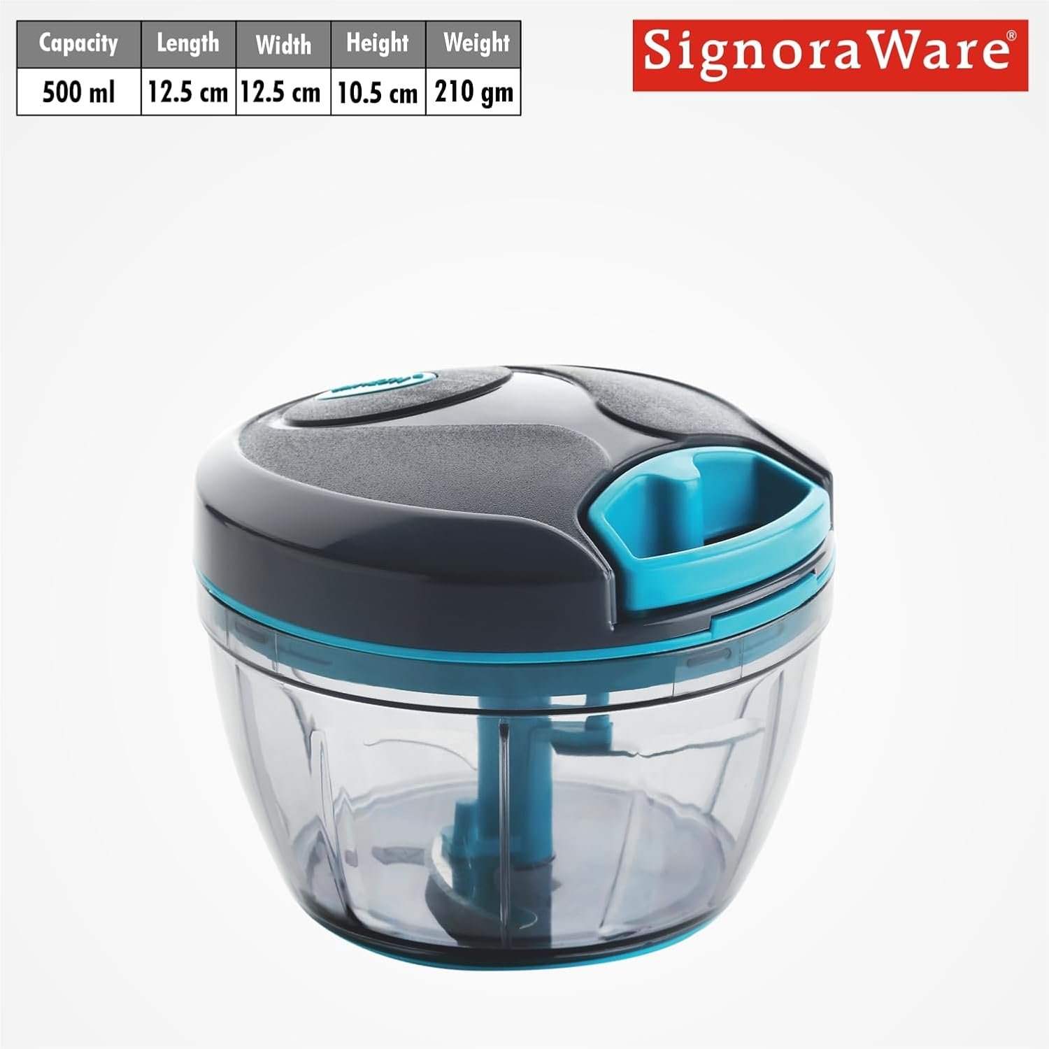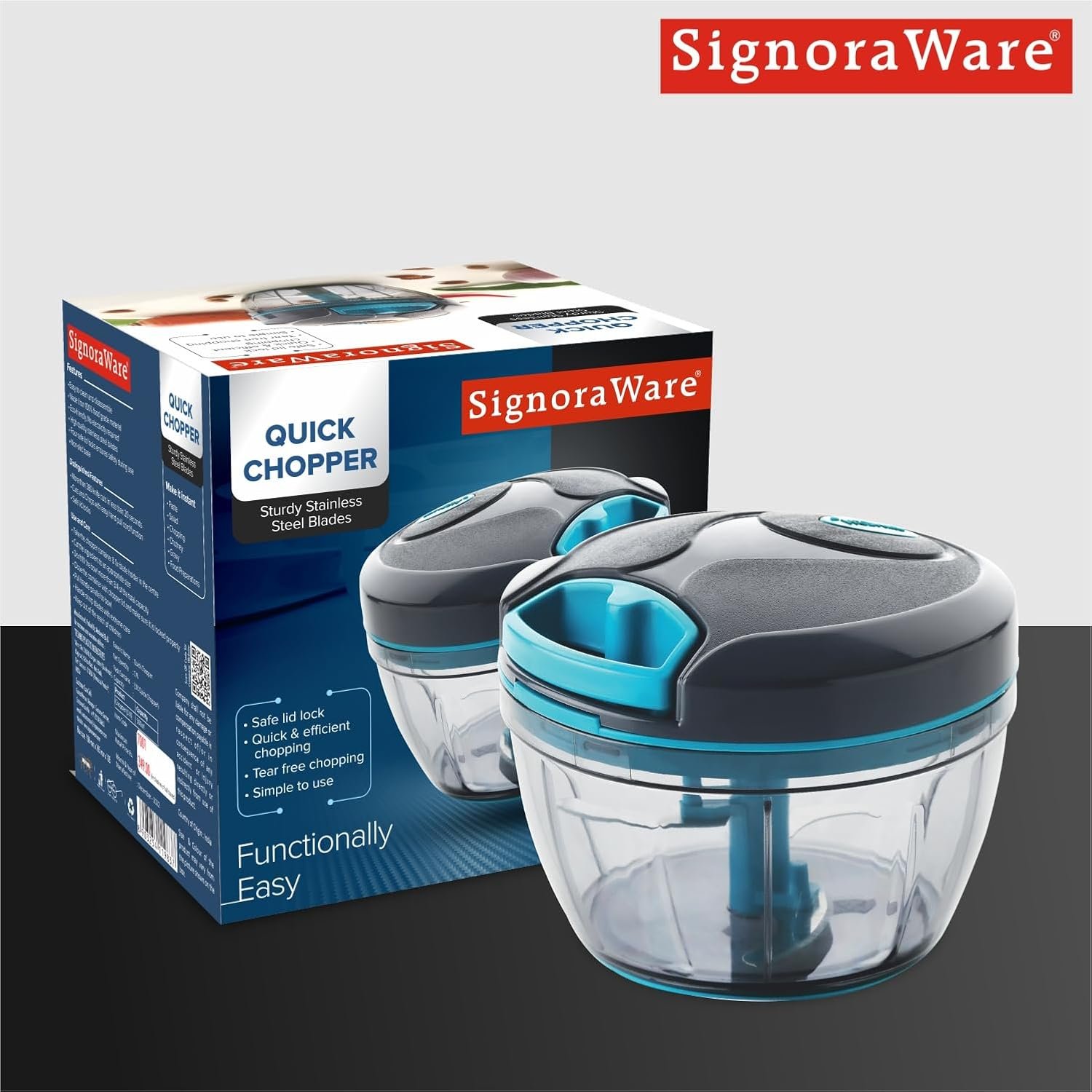 Key Features: The Signoraware Quick Chopper Featuring three efficient stainless-steel blades, this handy chopper utilizes a smooth spring-action pulling mechanism for effortless chopping. The number of pulls controls the fineness of the chop. Its 500ml capacity is suitable for a range of small to medium chopping needs in the kitchen.