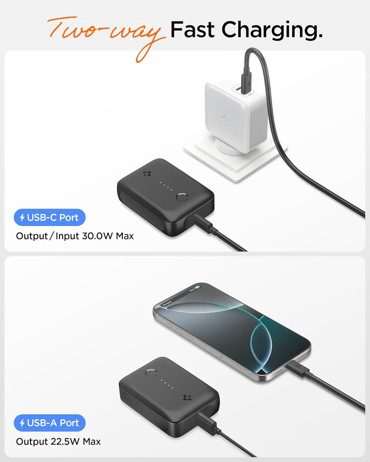 Spigen ArcPack 10000mAh Power Bank, 30.0W Fast Charging, 1 USB-C Port, 1 USB-A Port (C to C Cable Included) – (ABS + PC | Black)