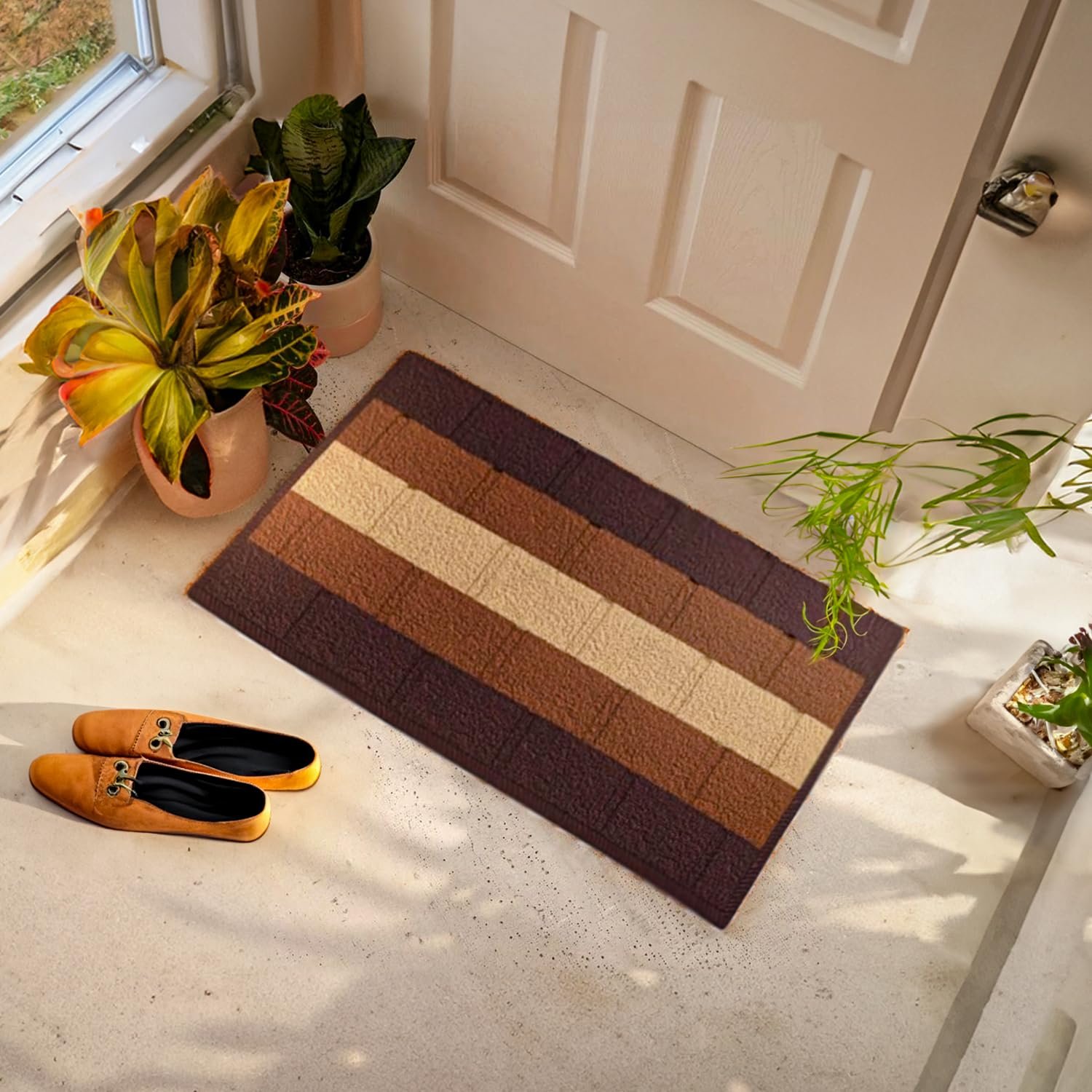 Versatile shape: Rectangular design fits seamlessly into any doorway, offering a welcoming entrance to your home or office. Whether it’s used as a front door mat to greet guests or placed at the back door to catch mud and dirt from outdoor activities, its universal shape allows for easy placement and accommodates various door sizes without compromising functionality.