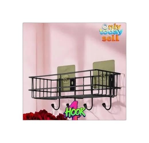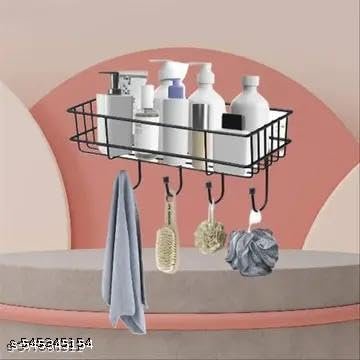 Steel Self-Adhesive Multipurpose Bathroom Shelf with Hooks/Towel Holder/Rack/Bathroom Accessories-Wall Mount – Pack of 1 (Black|Design – for Home and Kitchen