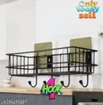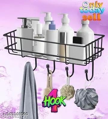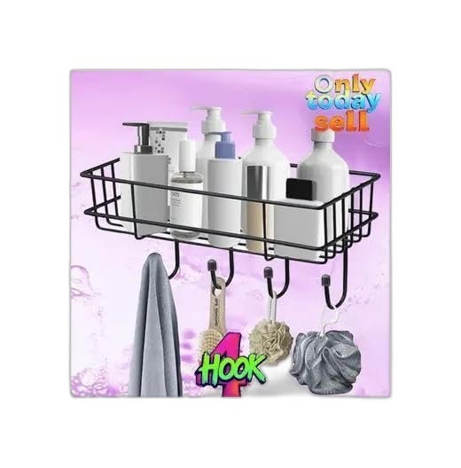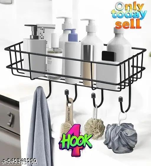 “Steel Self-Adhesive Multipurpose Bathroom Shelf with Hooks/Towel Holder/Rack/Bathroom Accessories-Wall Mount – Pack of 1 (Black|Design – for Home and Kitchen