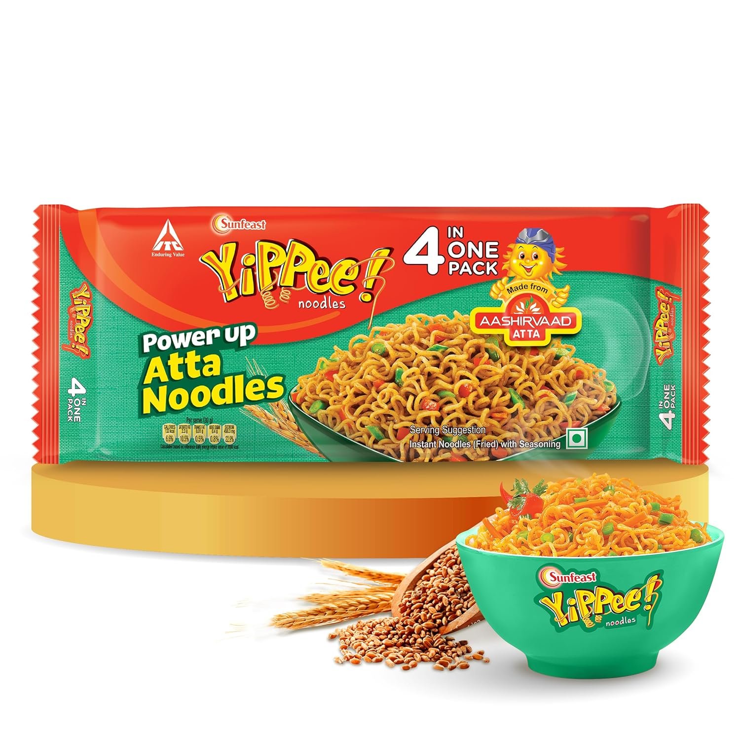 Sunfeast Yippee! Power Up Atta Noodles,Made with Aashirvaad Atta,Long,Non-Sticky,Instant Noodles,Delicious & Nutritious Snack,4 In 1 Pack,Vegetarian, 280 Gm/298 gm( weight may vary)