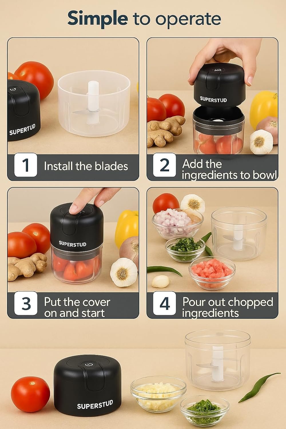 The SUPERSTUD mini electric chopper is a total game-changer in the kitchen! It’s compact yet surprisingly powerful—perfect for chopping garlic, ginger, onions, veggies, and even nuts in seconds. The rechargeable feature is super convenient, and the 250ml size is just right for everyday use. Cleaning is easy, and it’s backed by a 1-year warranty for peace of mind. A must-have for quick, mess-free prep!