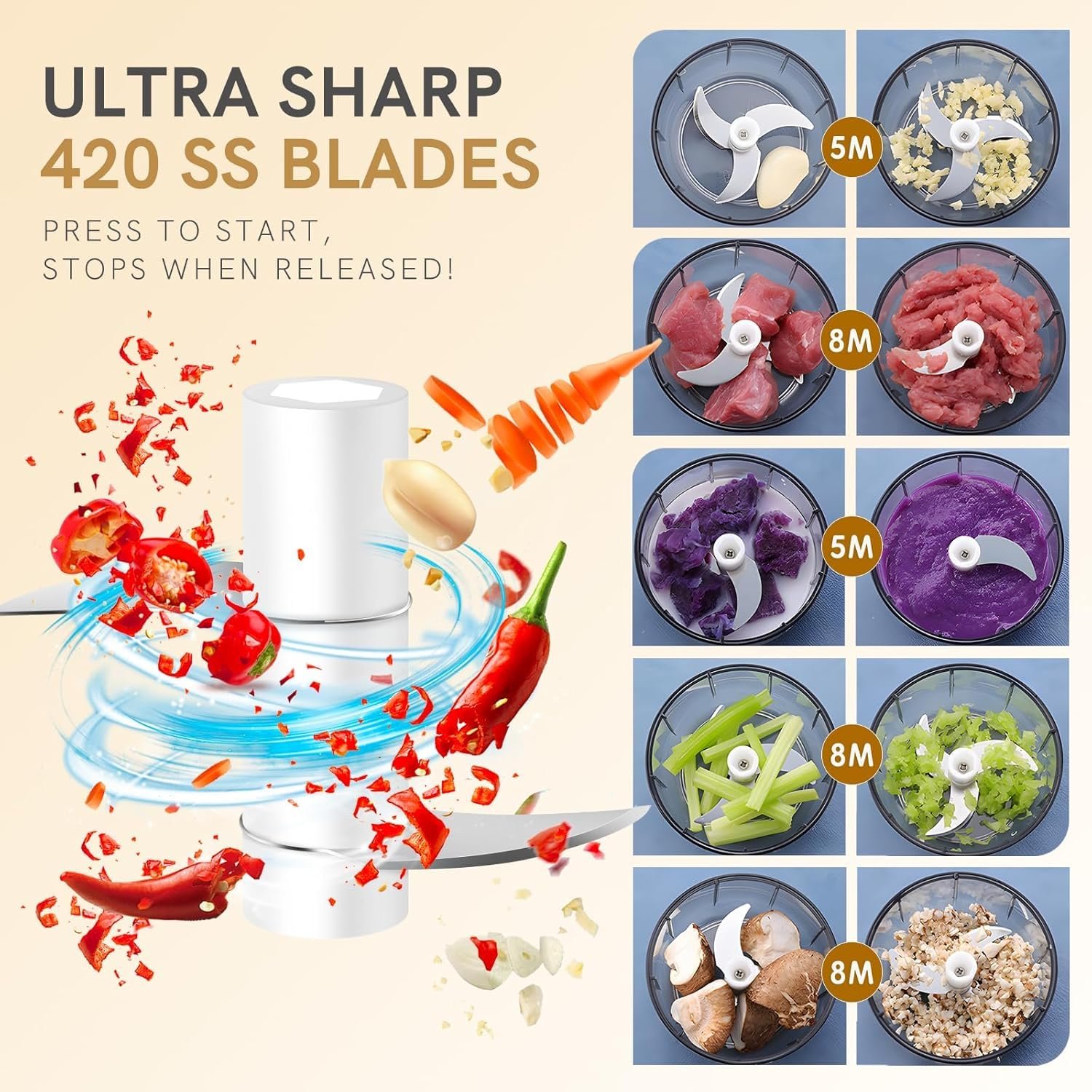It chops garlic, onions, veggies, and even nuts really quickly. The size is perfect for daily use, and it’s easy to clean too. I’ve used it multiple times and it still works smoothly. The rechargeable feature is really convenient, no need to keep plugging it in. Totally worth buying if you want something fast and efficient for the kitchen!