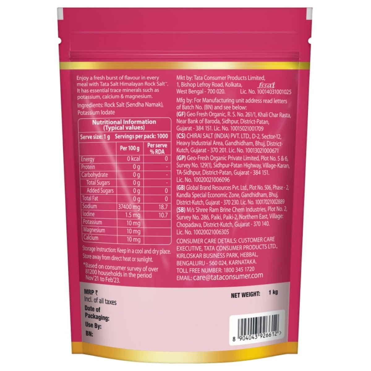 Be the first to review “Tata Himalayan Rock Pink Salt, 1kg Pouch, Premium Sendha Namak, With Natural Trace Minerals, Low Sodium, Crystal Salt”