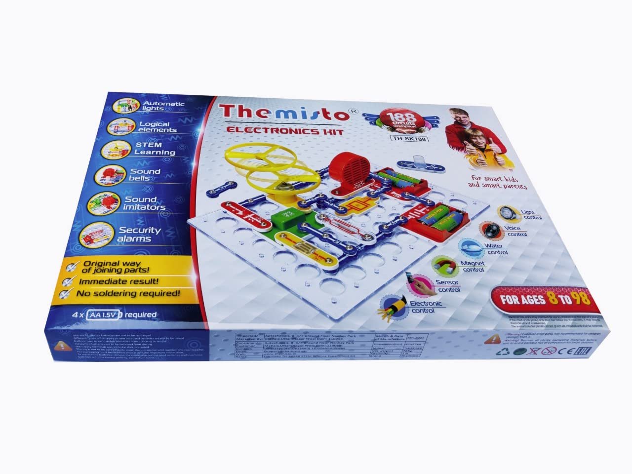 Give your child an exciting, hands-on introduction to electronics with Themisto electronic learning kit. This innovative kit contains over 32 color-coded, real circuit components that snap together to make working electronic circuits and devices. Recommended for youngsters 8 and older, this set offers 188 do-it-yourself projects which will give your child an entertaining, concrete education on how electronics work.