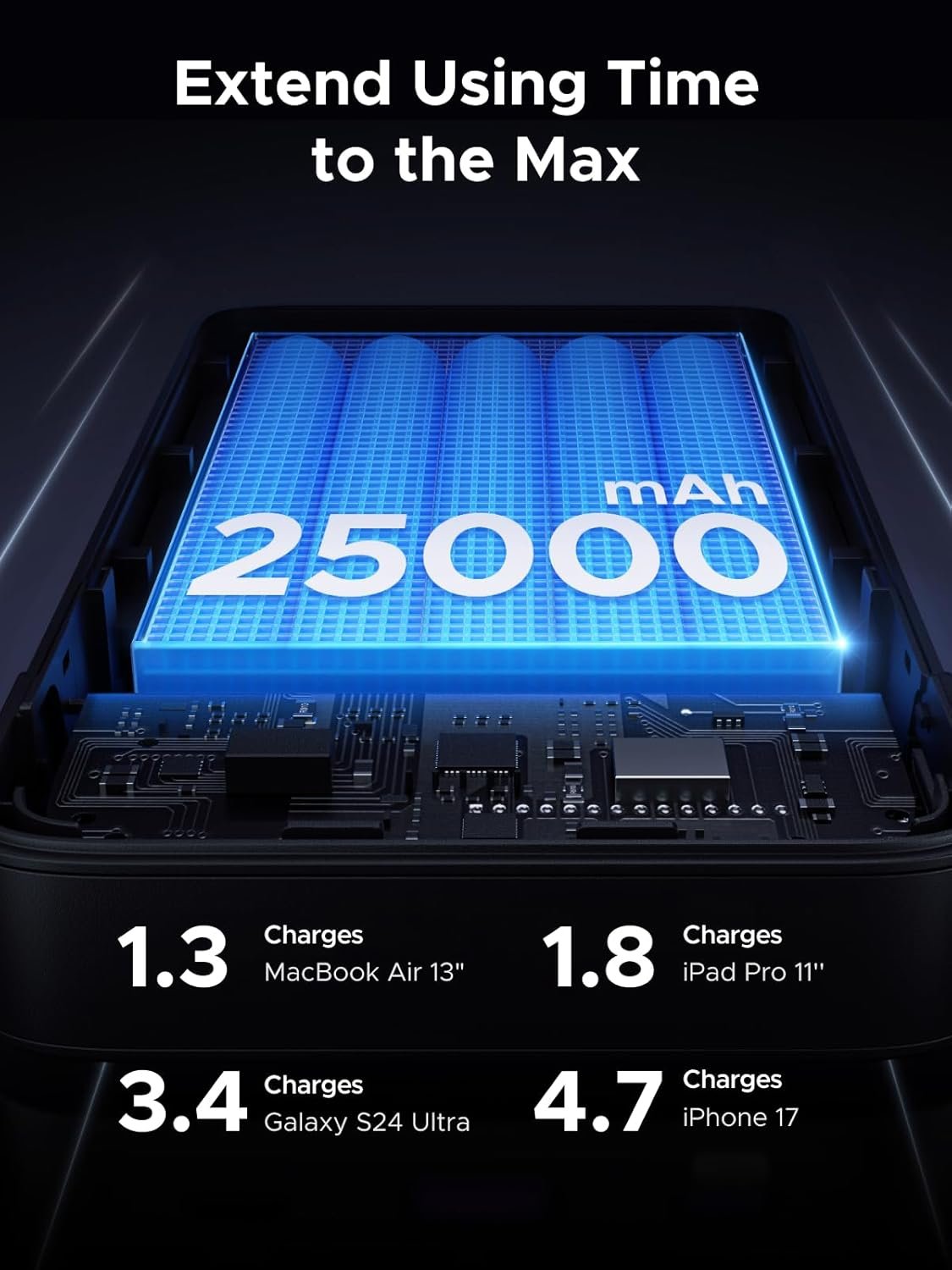 Two-Way Fast Charging: Easily recharge this 25,000mAh power bank in 2 hours with a 65W PD charger (not included). With our bi-directional technology, fast charge devices while fast recharging this portable charger.