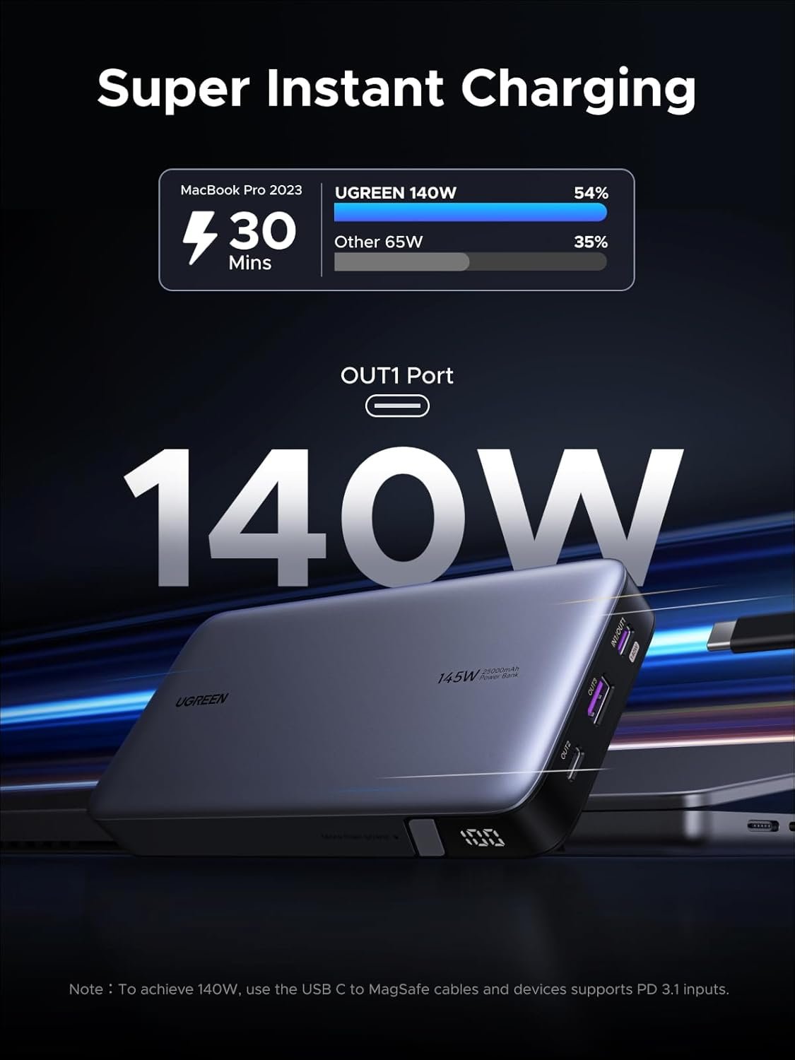 UGREEN PB205 145W Power Bank 25000mAh Portable Charger USB C 3-Port PD3.0 Battery Pack Digital Display, 65W Fast Recharge, Compatible with MacBook Pro,Laptop, iPhone 14 Series, Samsung