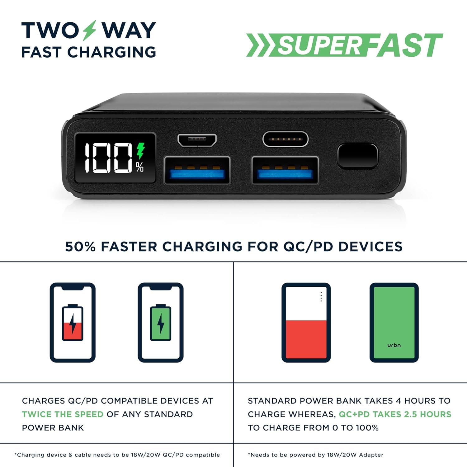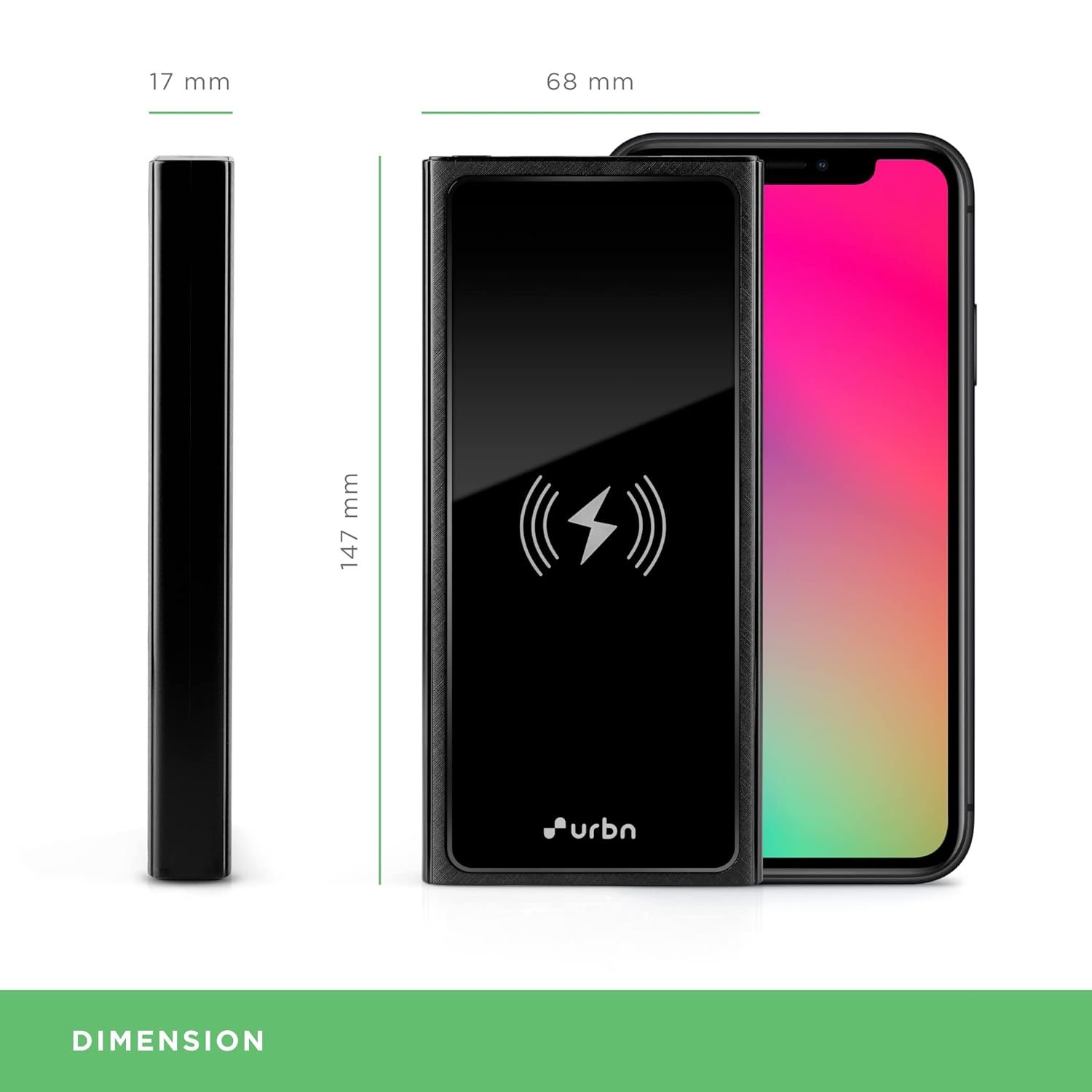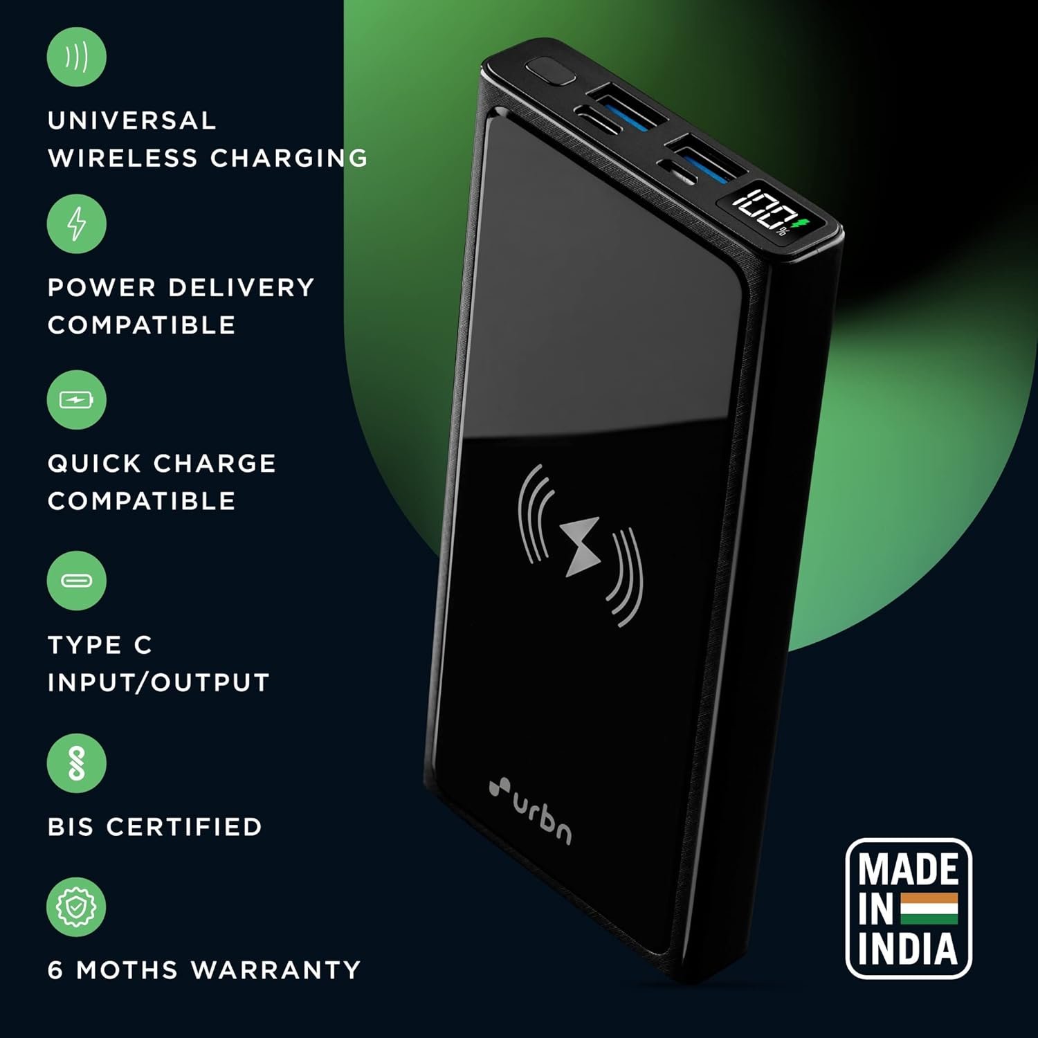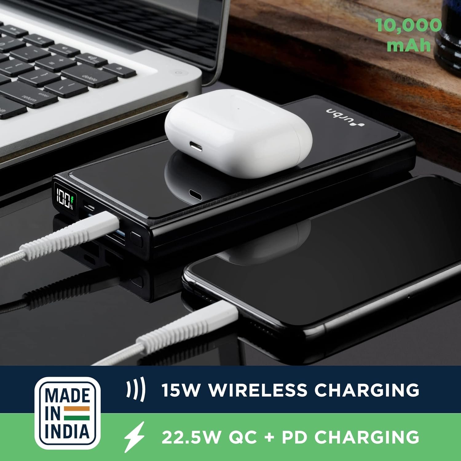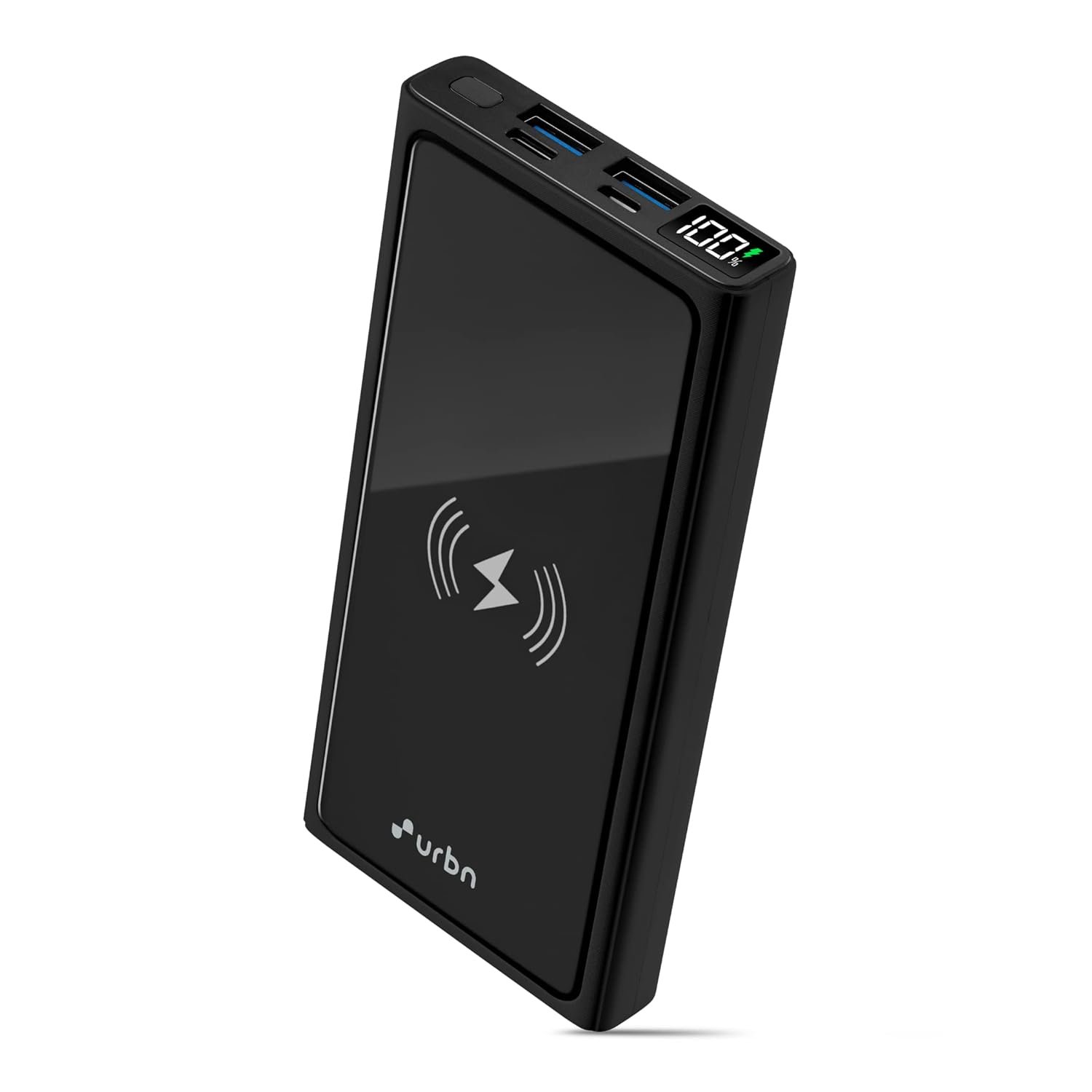 URBN 10000 mAh Lithium_Polymer 15W Super Fast Charging Wireless Power Bank with 22.5W Type C PD (Input& Output) and QC 3.0 Dual USB Output with Free Type C Cable (Black)