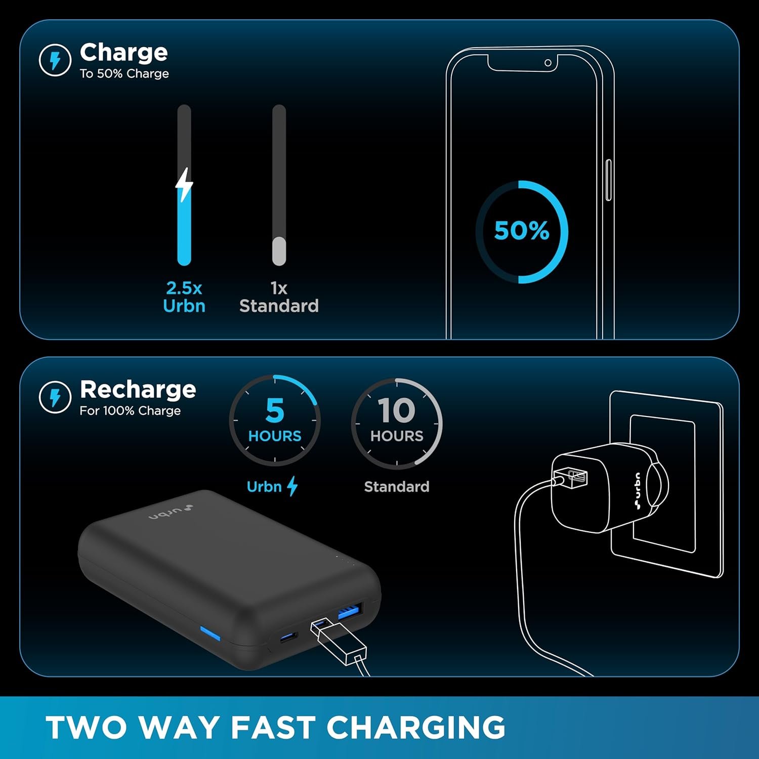 Two-Way Fast Charge: The URBN 20000 mAh Premium Black Edition Nano Power Bank features two-way fast charging, allowing you to charge your devices and the power bank itself simultaneously. Get the power you need when you need it most.