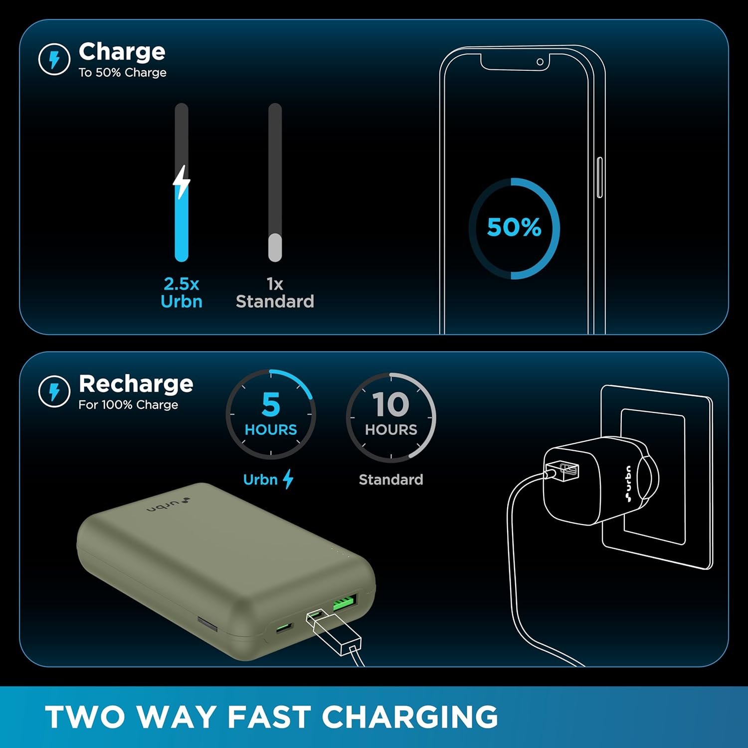 Two-Way Fast Charge: The URBN 20000 mAh Premium Black Edition Nano Power Bank features two-way fast charging, allowing you to charge your devices and the power bank itself simultaneously. Get the power you need when you need it most.