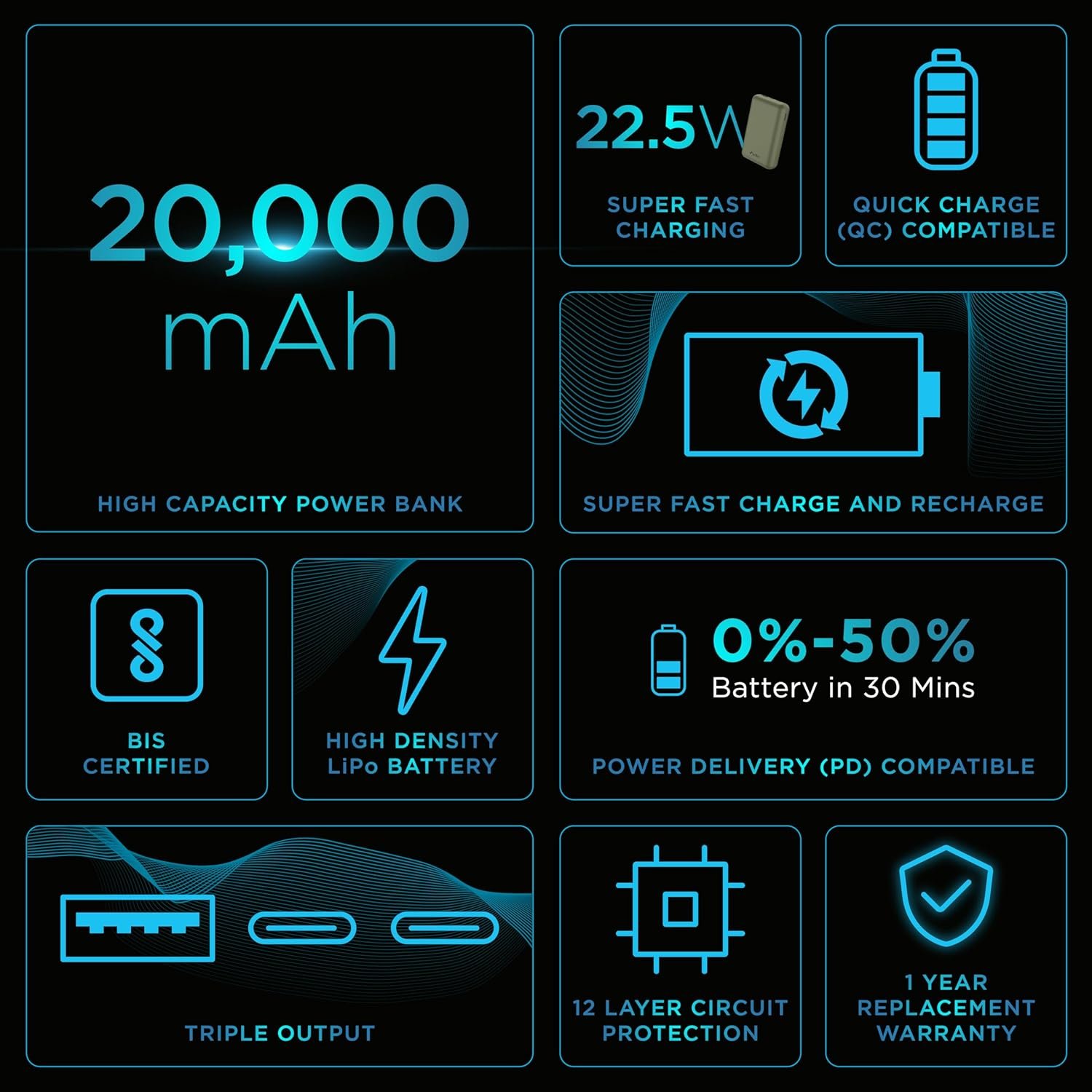 URBN 20000 mAh Premium Nano Power Bank | 22.5W Super Fast Charging | Smallest Power Bank | Dual Type C Power Delivery (PD) Output + 1 USB Output for Quick Charge | Two-Way Fast Charge (Camo)