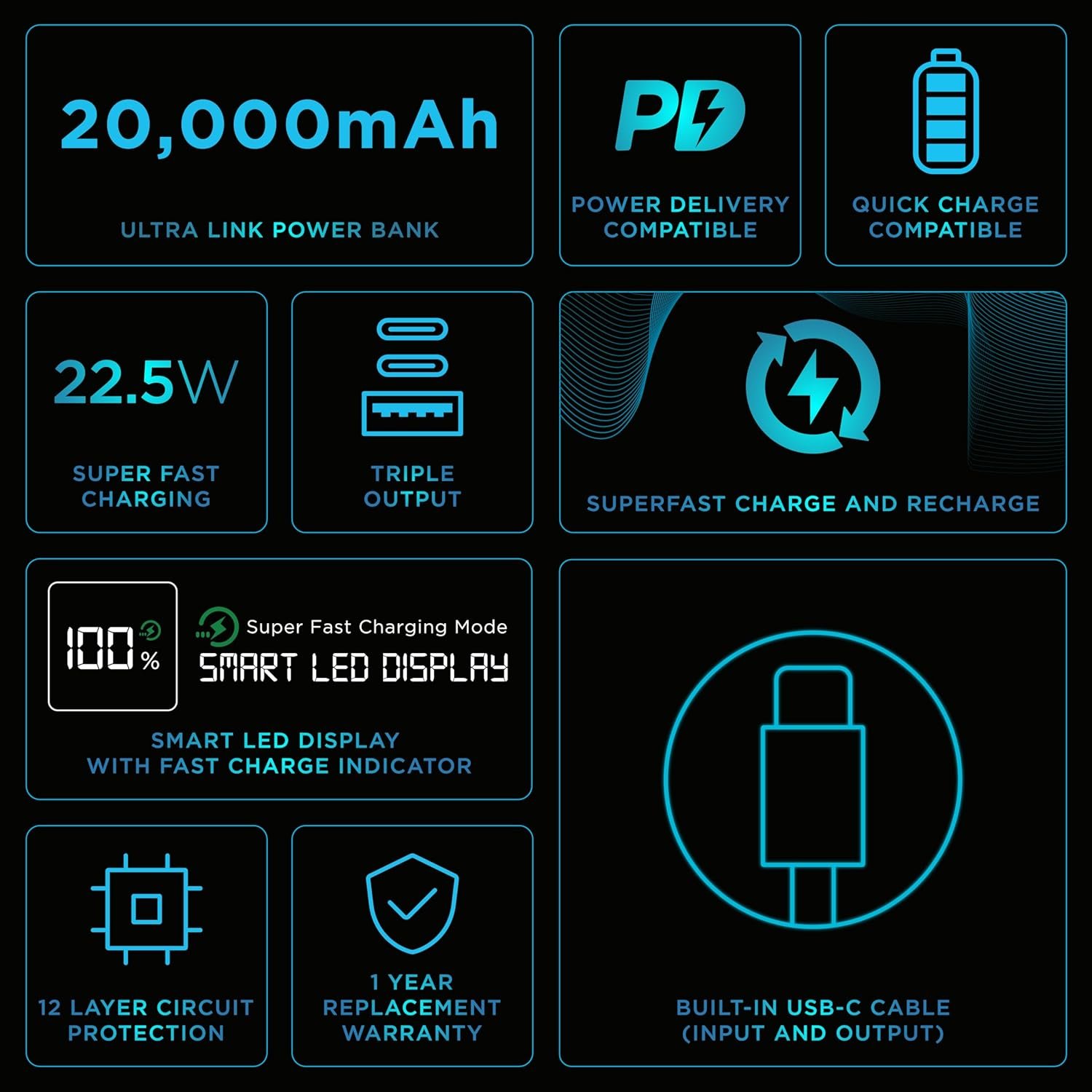 The URBN 20000mAh power bank is impressive. It charges devices quickly with its 22.5W fast charging and the built-in Type-C cable is super convenient—no need to carry extra wires. The compact design makes it easy to carry in a bag, and the battery backup easily lasts for multiple phone charges. Great build quality and worth the price. Highly recommended for heavy users and travelers.