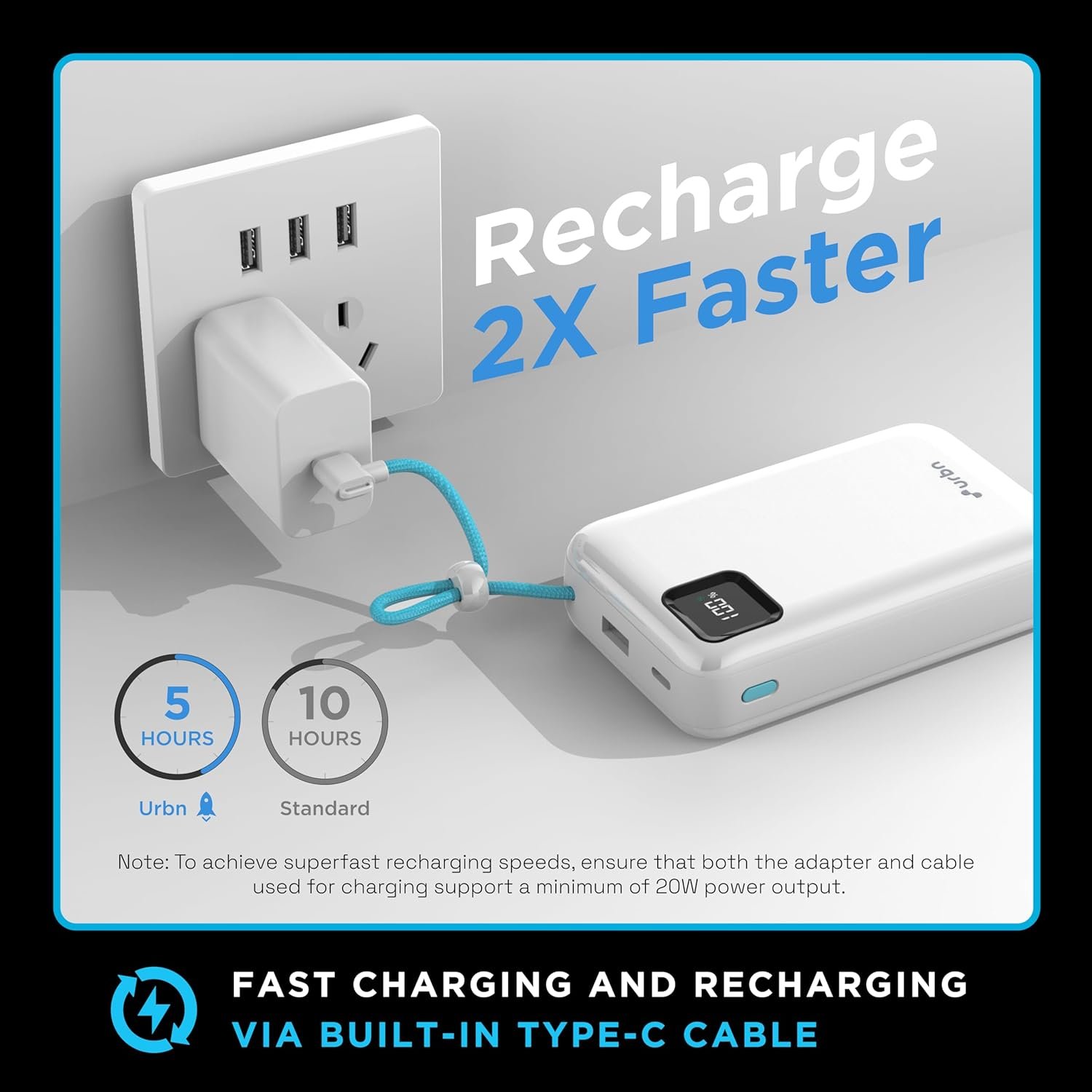 URBN 20000mAh Power Bank with Built-in Type-C Cable | 22.5W Super Fast Charging | Smart LED Display | Dual USB Type-C Output PD + USB Outputs | Pocket Size Portable Charger for Quick Charge (White)