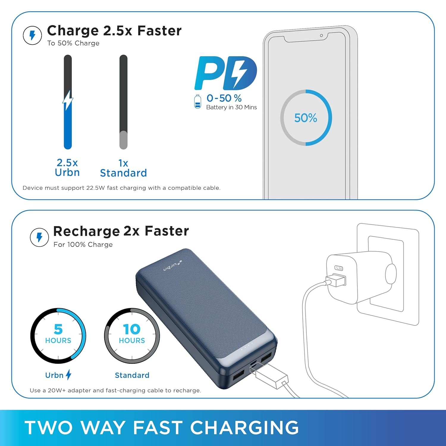 URBN Power Bank 20000mAh Fast Charging | 22.5W Super Fast Power Delivery (PD) Portable Charger | Triple Output | USB Type-C Input & Output | Pass Through Charging | (Blue)