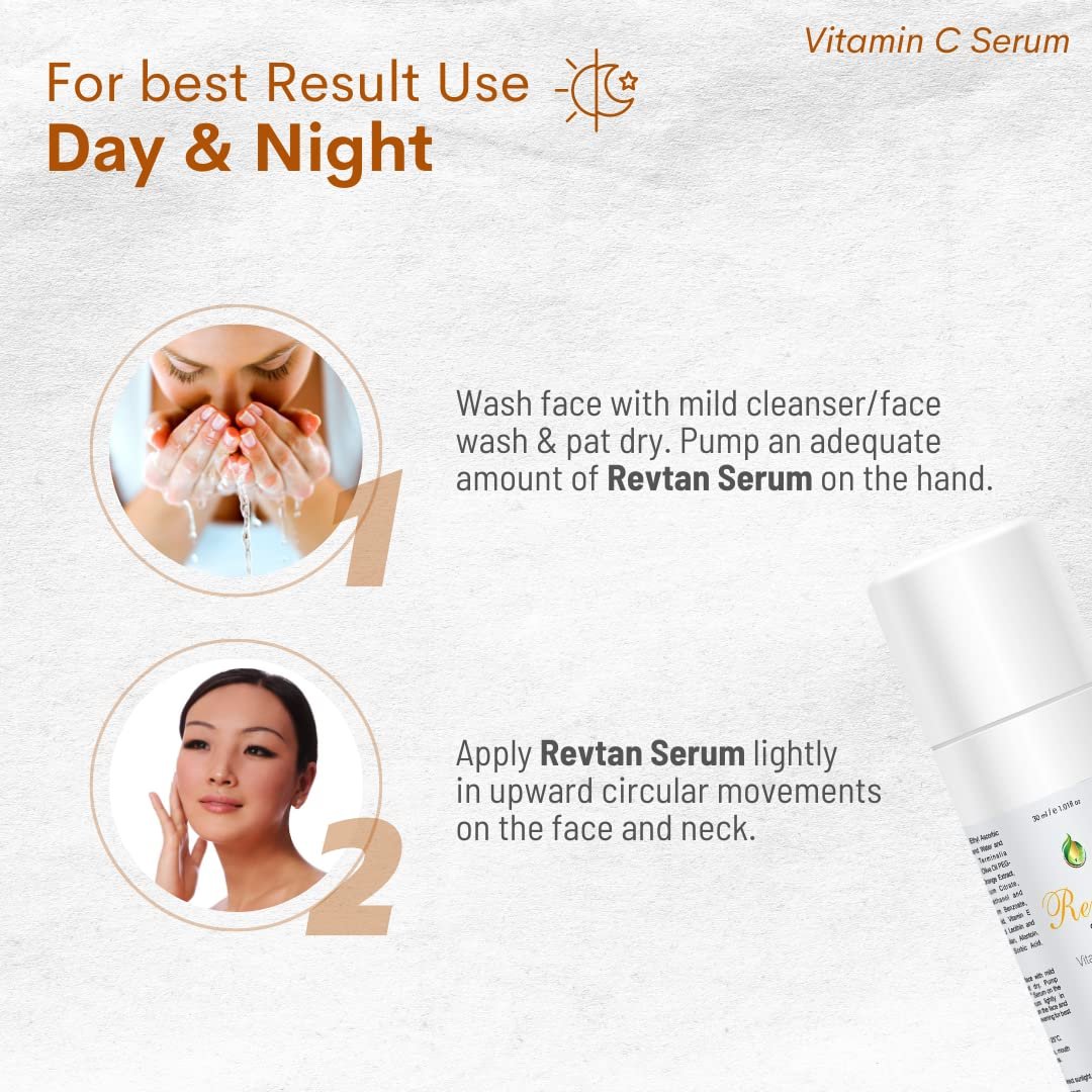 Wash face with mild cleanser or face wash and pat dry. Pump adequate amount of revtan serum on the palm. Apply revtan serum lightly in upward circular movements on the face and neck for a minute or two. Apply in the morning and evening for best results.