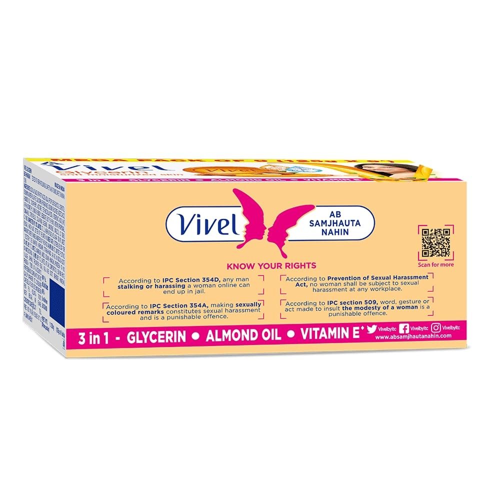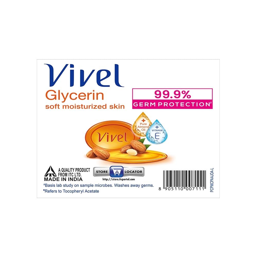 Vivel Glycerin Bathing bar soap is enriched with Pure Glycerin and Almond oil & Vitamin E . It nourishes your skin from deep inside giving you soft moisturized skin