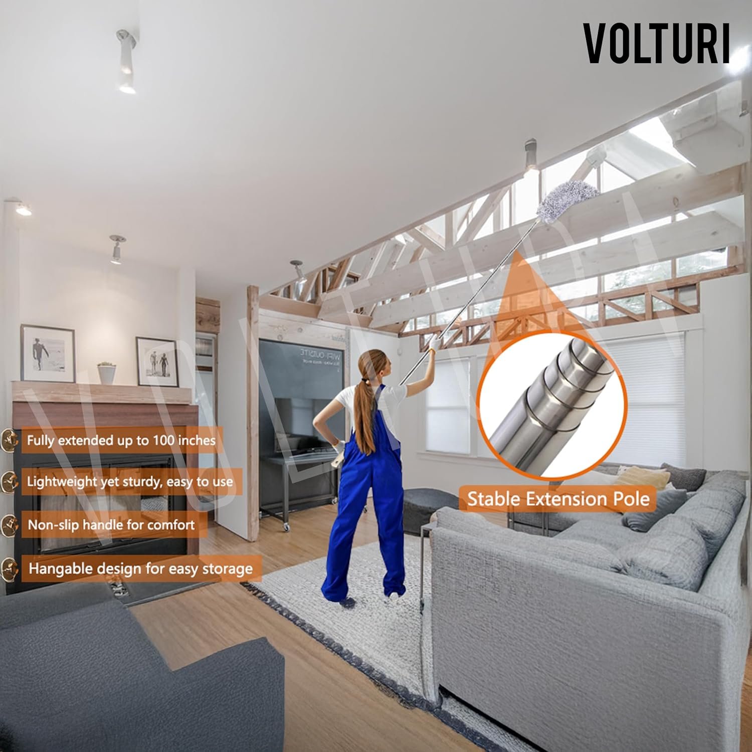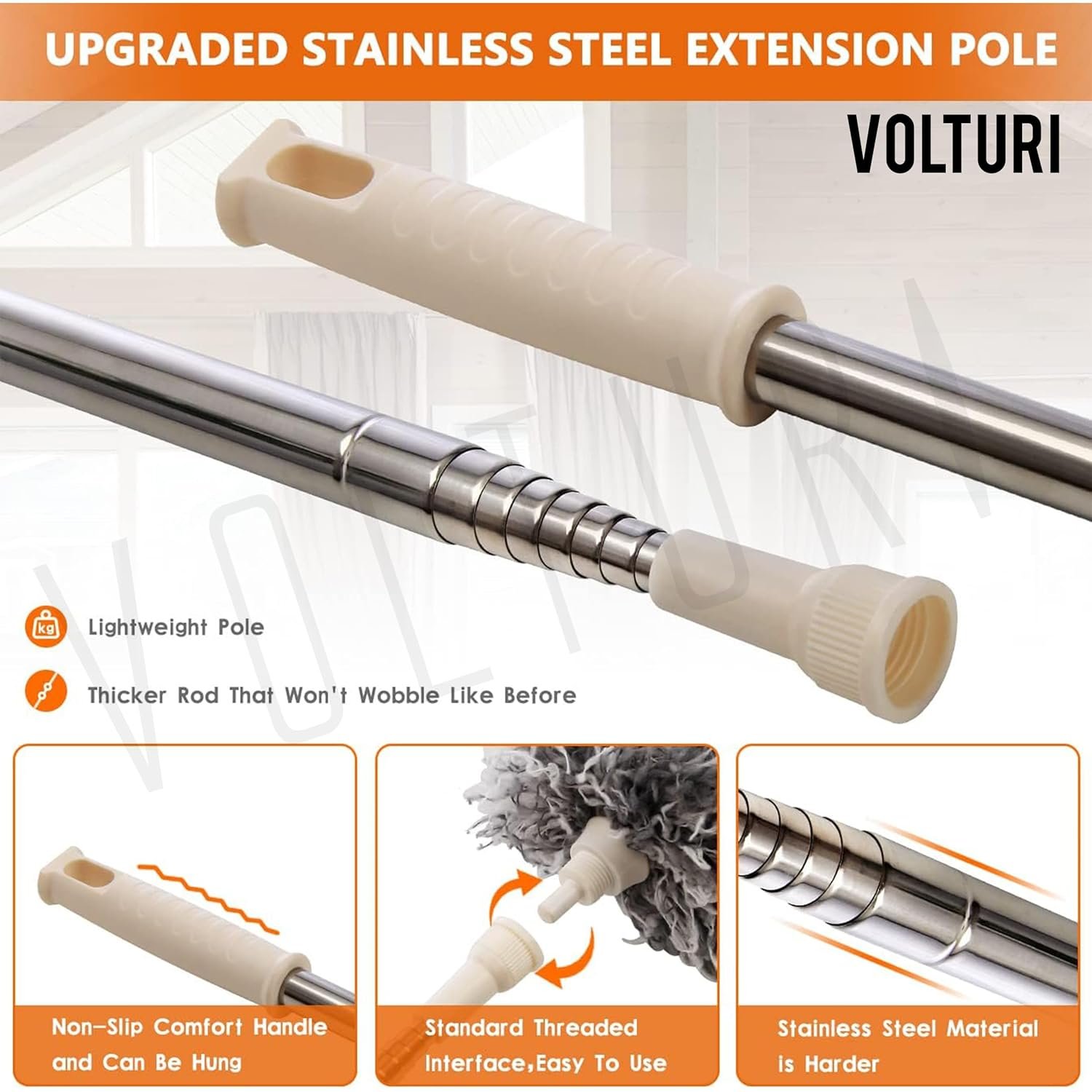 Extendable Long Pole With high quality 100 inch long stainless steel telescopic pole you dont need to take risks cleaning the high areas anymore just use this duster for cleaning and extend the length of duster pole from 30 to 100 inches to clean the dust easily.
