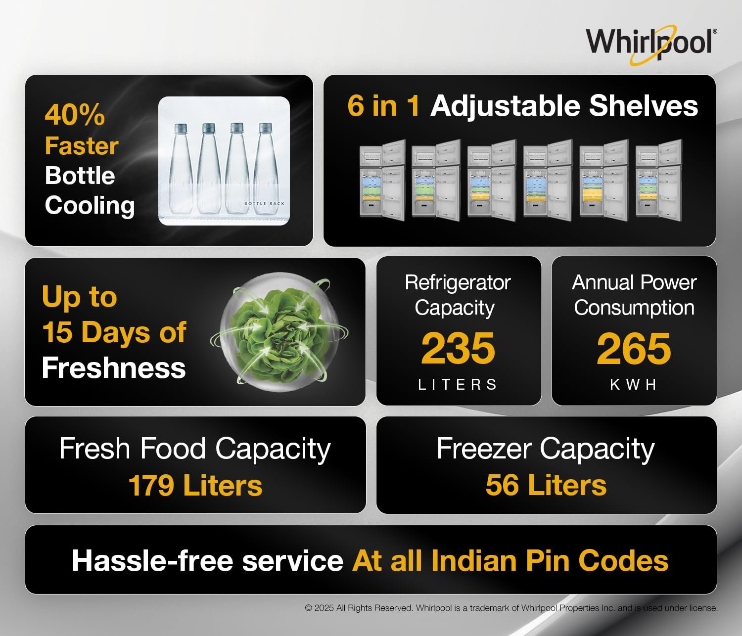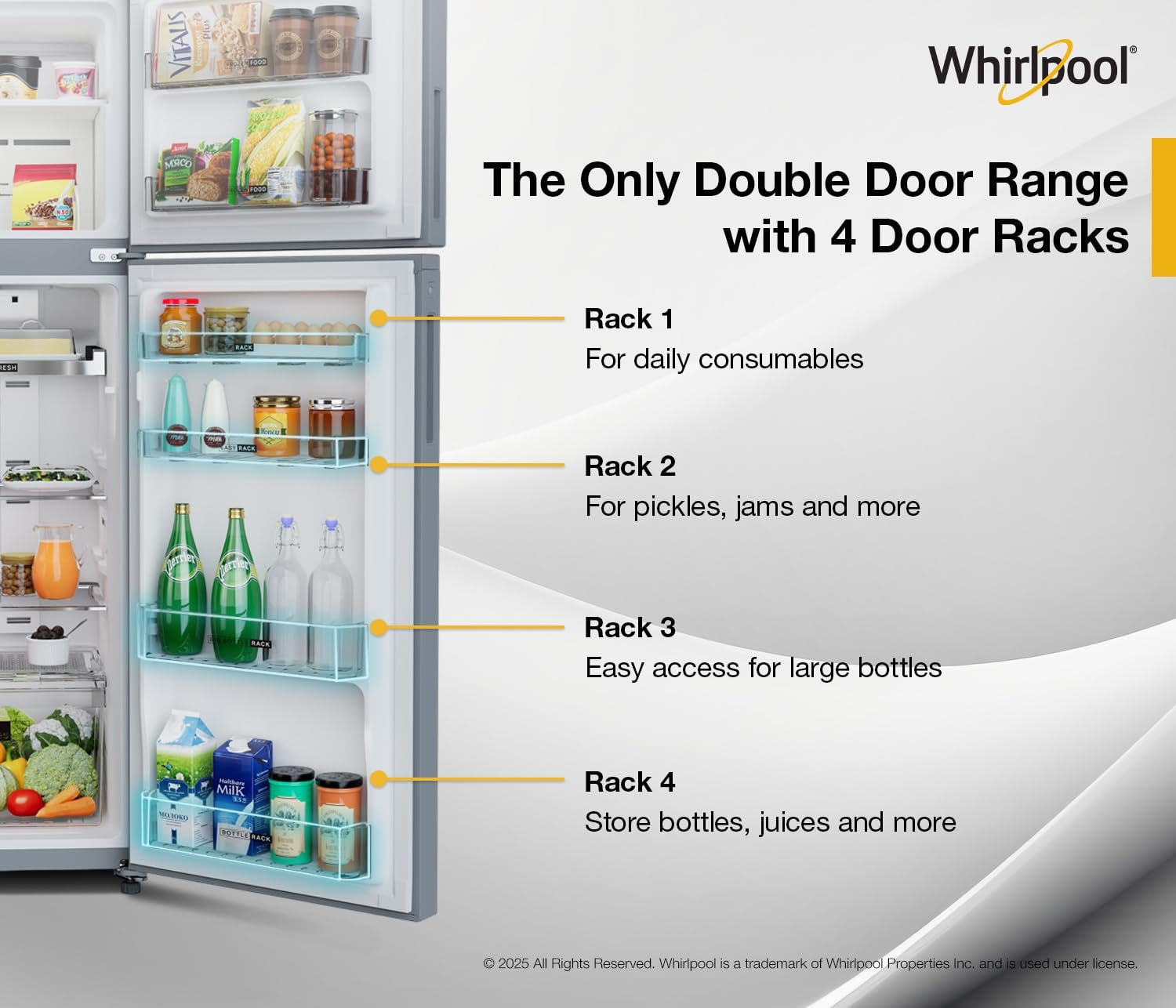 Whirlpool refrigerators have 6 possible shelves combinations, giving ultimate Flexibility and Max utilization of space. No other brand in this capacity offers such flexibility.