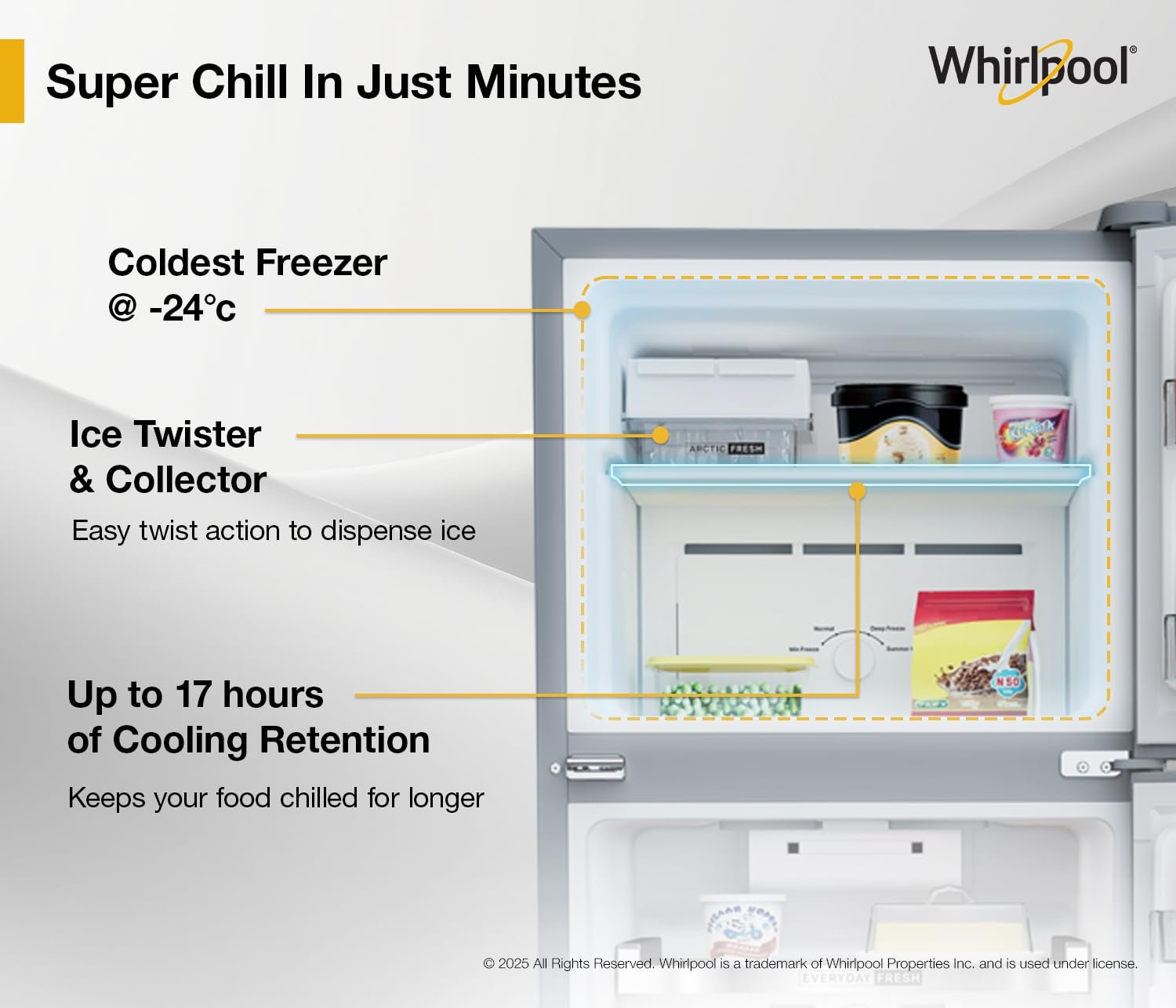 Brand Features : Knob Inside Refrigerator, Get Ice In Up 85 Minutes, 40% Faster Bottle Cooling, Anti-Odour Action, Coldest Freezer As -24C, 99.9% Bacterial Growth Prevention, Inverter