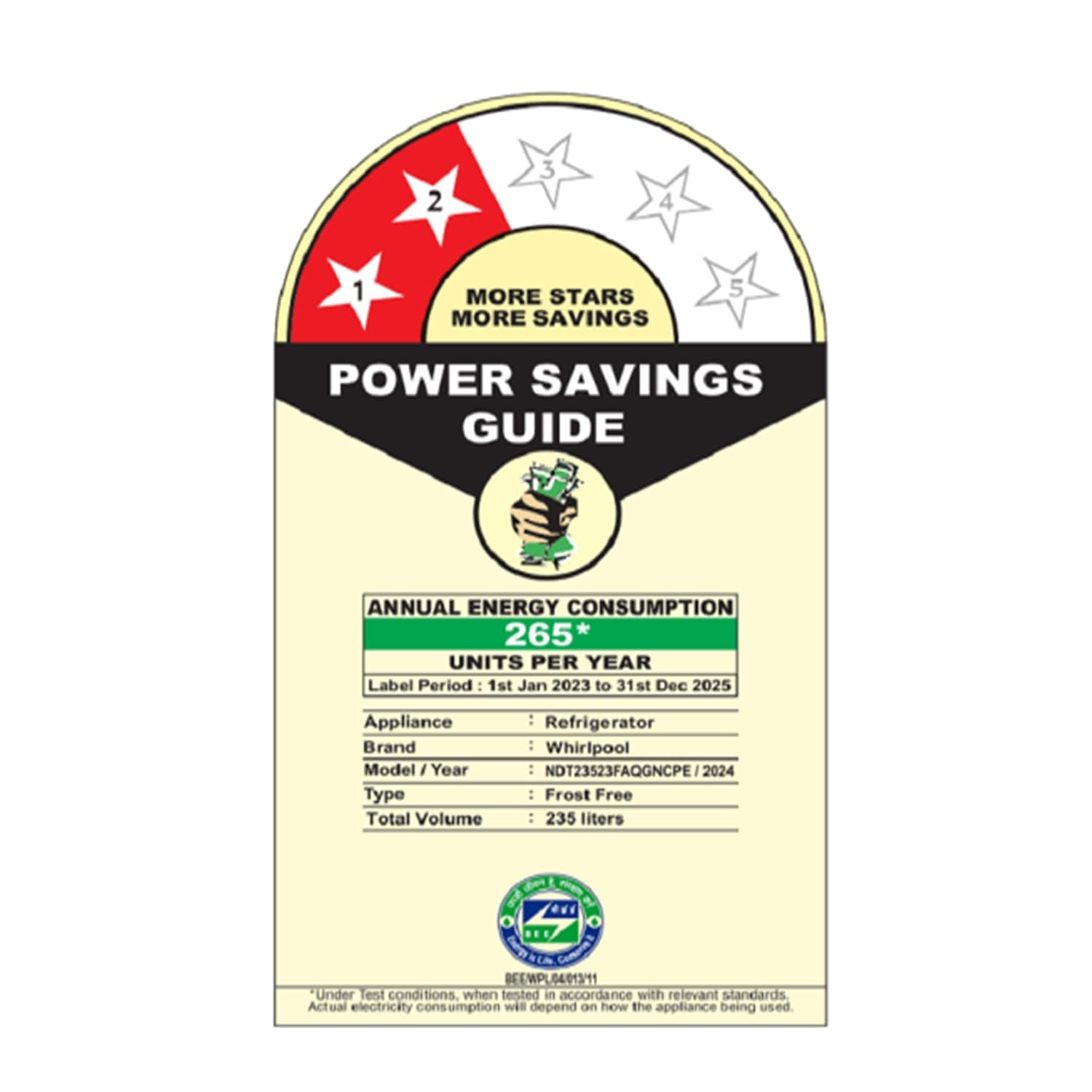 Energy Rating 2 Star: Best in class efficiency | Annual Energy consumption – 265* Units Per Year (Please refer BEE label for more information), Model/Year : NDT23523FAQGNCPE/2024