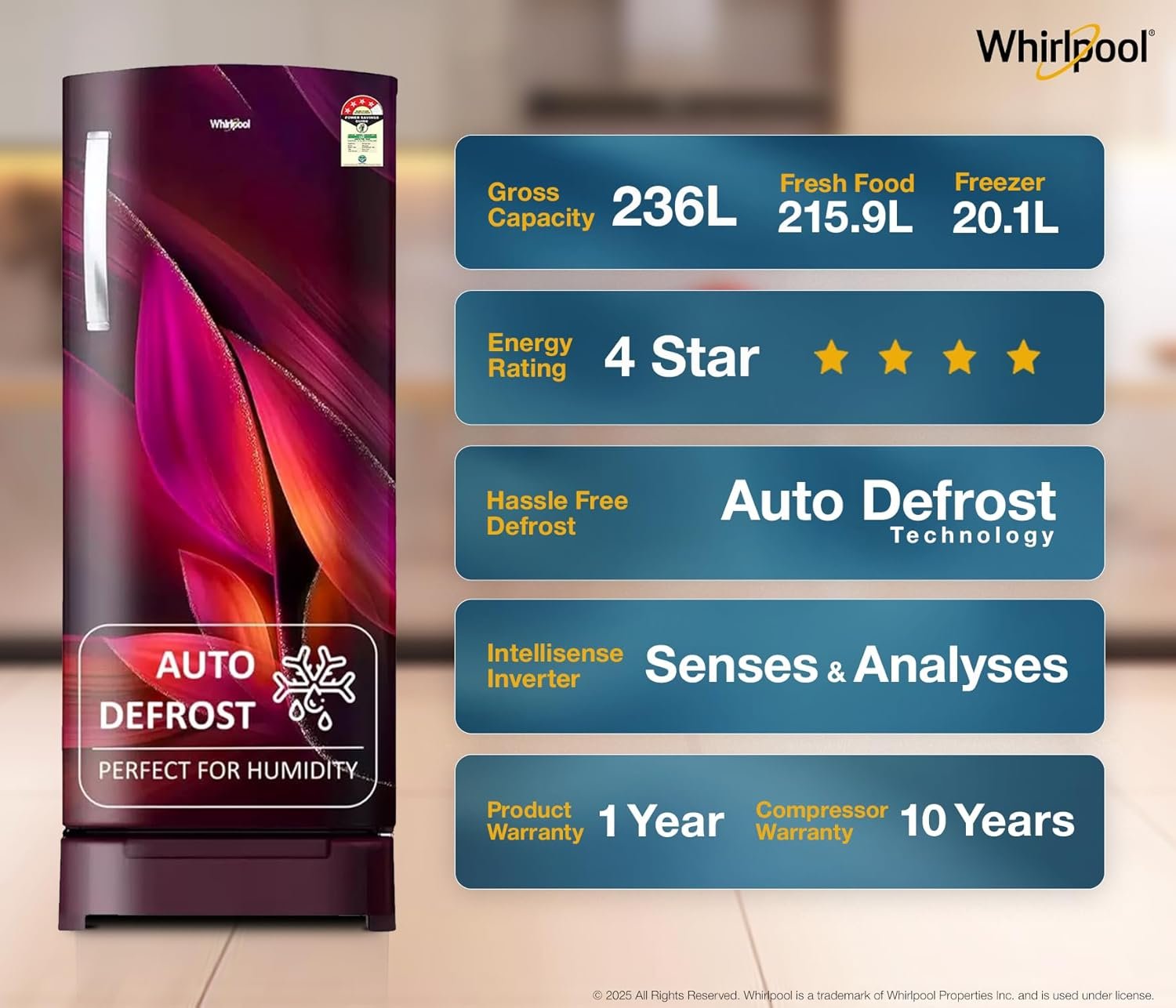Whirlpool 236 L 4 Star Frost Free Inverter Direct-Cool Single Door Refrigerator (Auto-Defrost, Intellisense Inverter, 260 IMPRO PLUS ROY 4S WINE Breeze-Z)