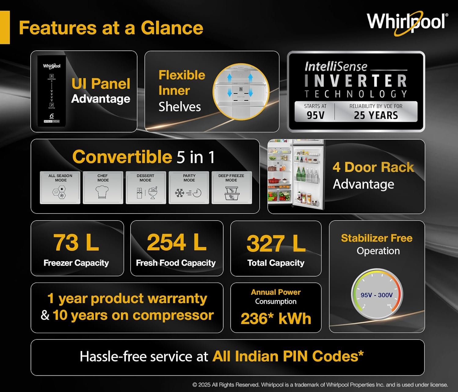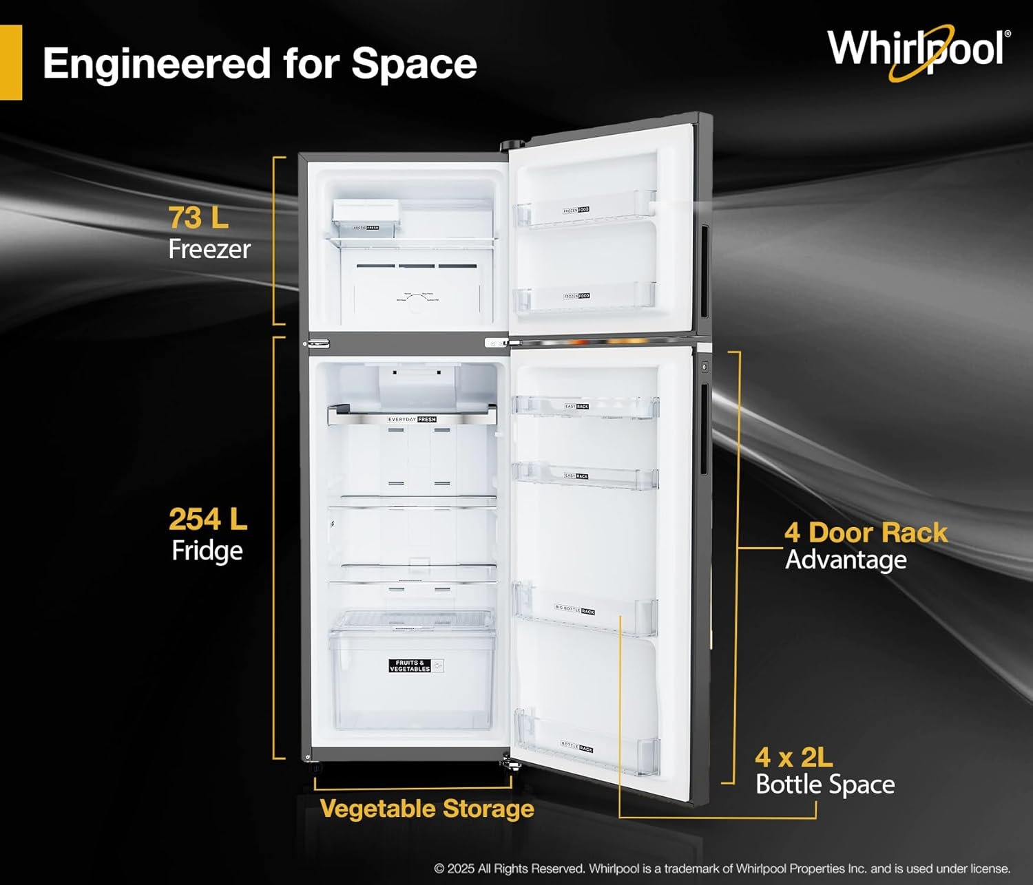 🌟🌟🌟🌟🌟 5/5 – Excellent Performance & Value for Money!I recently purchased a Whirlpool refrigerator, and I must say it has exceeded my expectations in every way. From its sleek design to its energy-efficient performance, this refrigerator is a perfect fit for any modern kitchen.Key highlights:• Powerful cooling: Keeps fruits, vegetables, and dairy products fresh for longer periods. Even in peak summer, it maintains consistent temperature.• Spacious & well-organized: The compartments are thoughtfully designed, making it easy to store and access everything.• Silent operation: It runs quietly in the background without any disturbing noise.• Energy-efficient: Noticeable drop in my electricity bill since switching to Whirlpool.• Sturdy build: High-quality materials give it a premium and durable feel.Overall, Whirlpool has truly delivered a fantastic product. I would highly recommend it to anyone looking for a reliable, stylish, and energy-saving refrigerator. Worth every rupee!