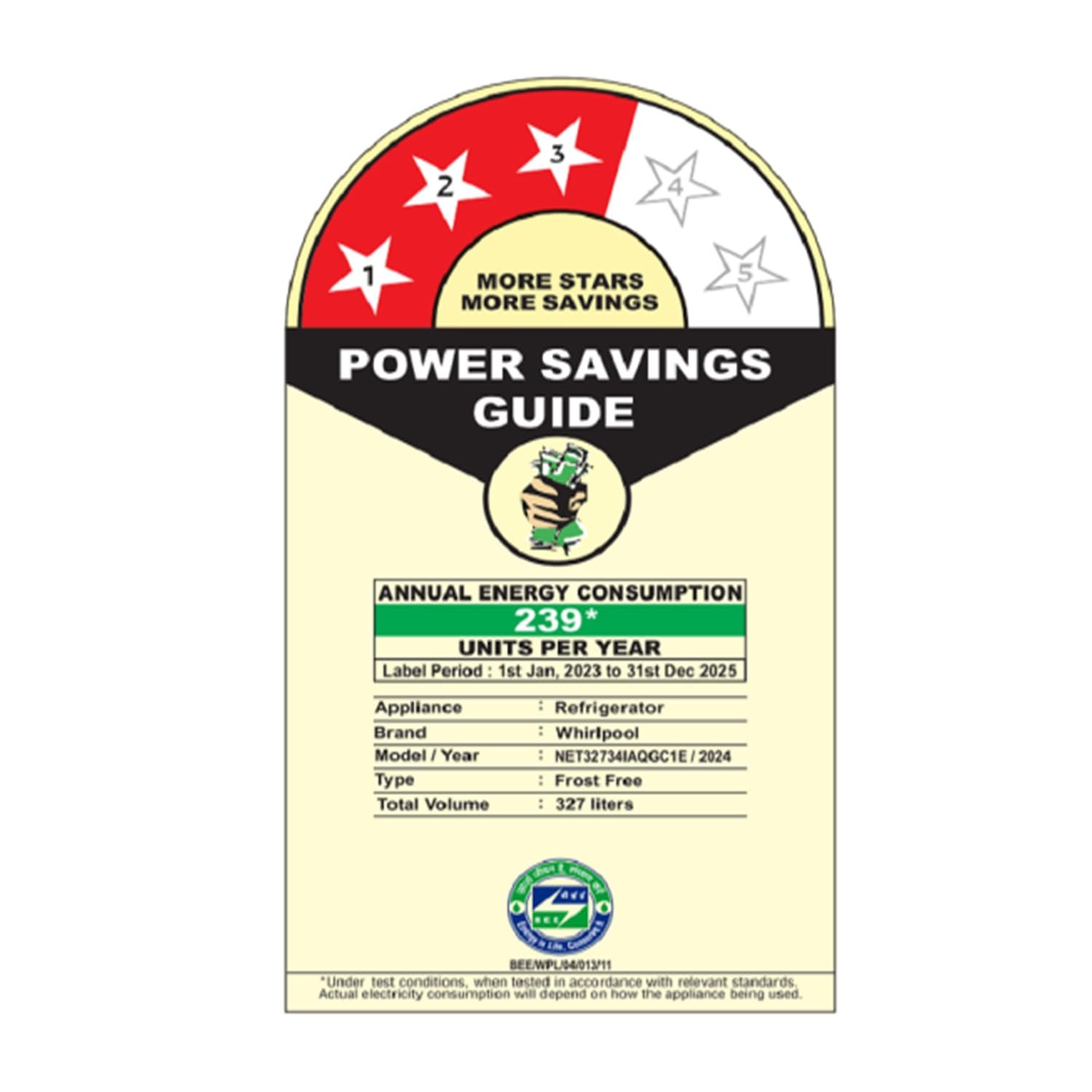 Energy Rating 3 Star: Best in class efficiency | Annual Energy consumption – 239* Units Per Year (Please refer BEE label for more information), Model/Year : NET32734IAQGC1E/2024.