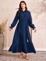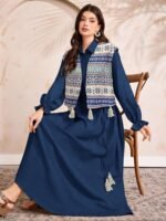 This dress looks very elegant with its deep navy blue color and long flowing design. Printed vest with tassels adds a stylish touch. Comfortable, classy, and perfect for casual or festive occasions.